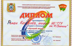 Наш вуз на сцене представила команда факультета физики и информационных технологий, которая осенью 2017 года завоевала титул победителей внутривузовского конкурса «А ну-ка, первокурсник!». По итогам фестиваля будущие физики были награждены дипломом в номинации «Арт-декор». Звание «Лучшая мужская роль» также досталась студенту ГГУ Роману Ковалеву.