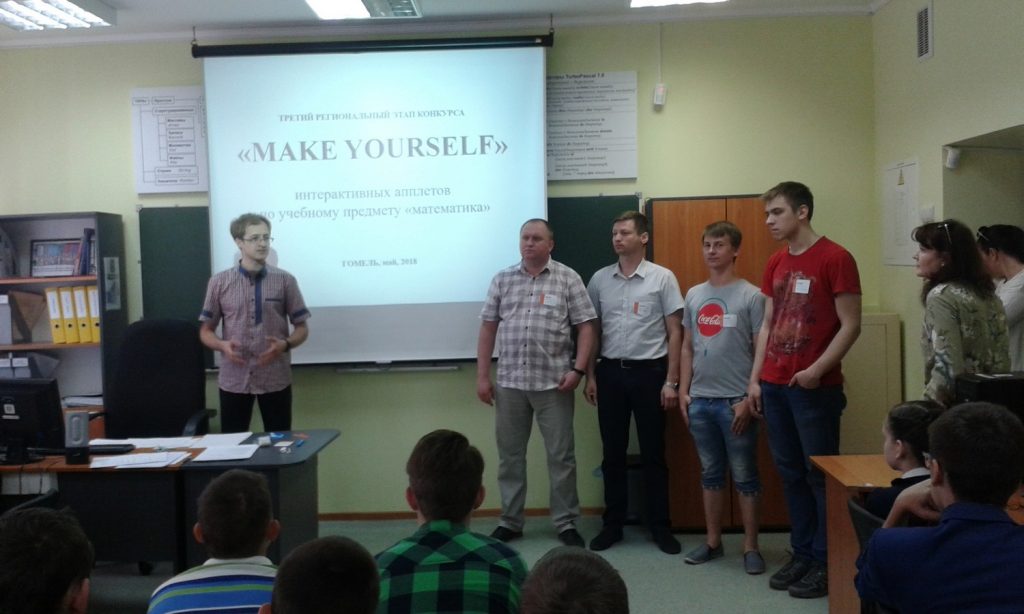 10 мая в Гомельском областном Дворце творчества детей и молодежи прошел третий региональный этап конкурса интерактивных апплетов по учебному предмету «Математика» «MAKE YOURSELF». Данное интеллектуальное состязание проводится с целью поиска оптимальных педагогических и технологических решений в области информатизации образования, стимулирования интереса педагогов, обучающихся, широкой общественности к использованию информационно-коммуникационных технологий. Инициатором проведения конкурса являются учреждения образования города Минска.