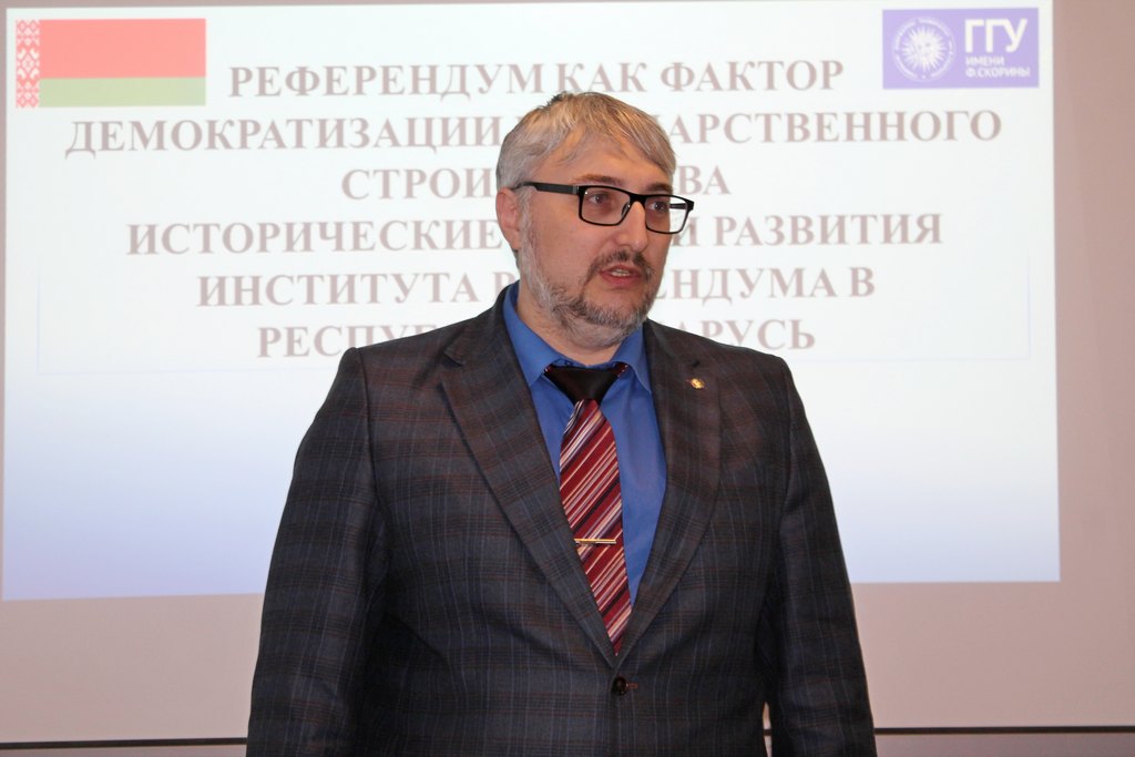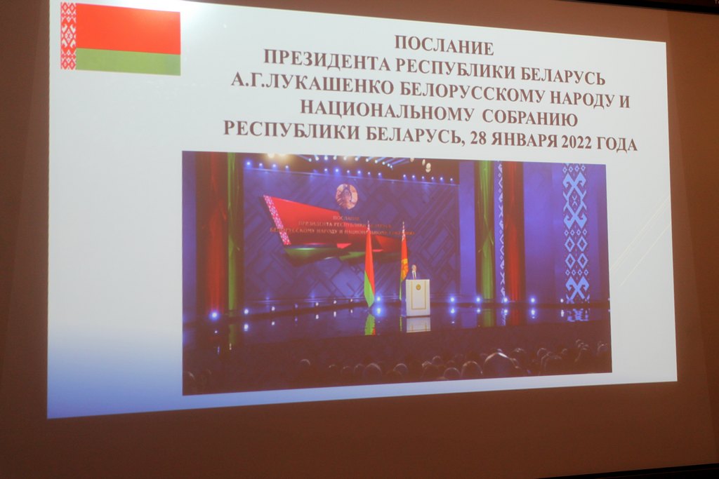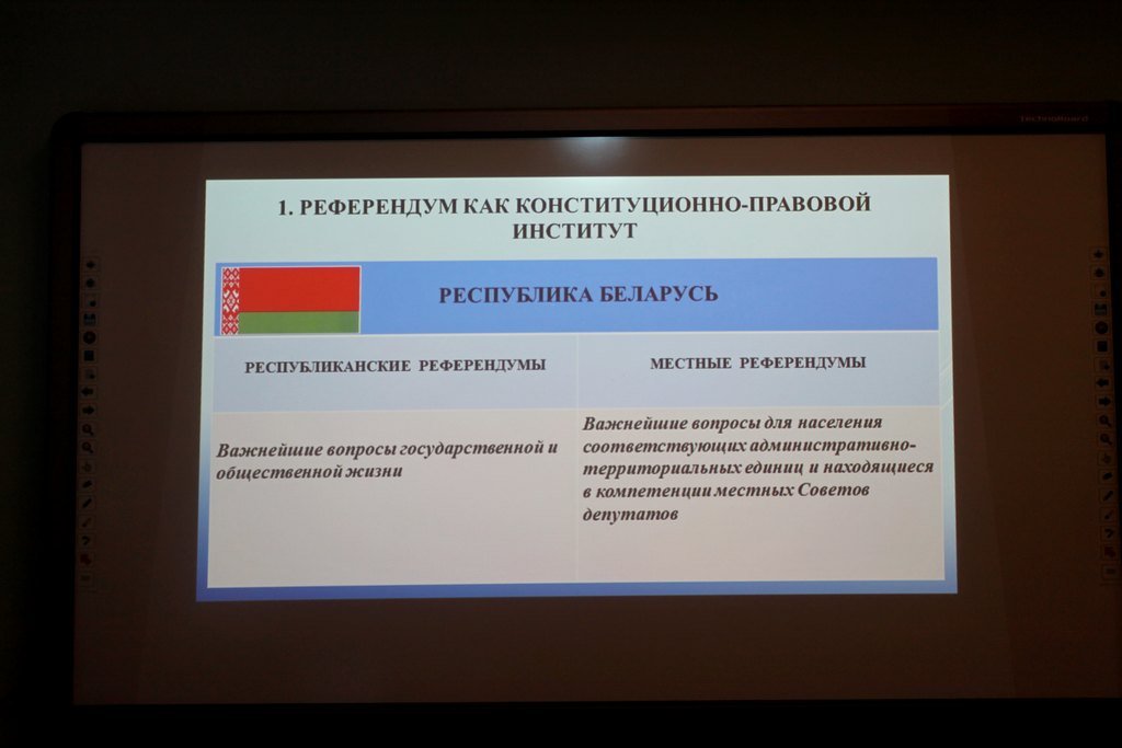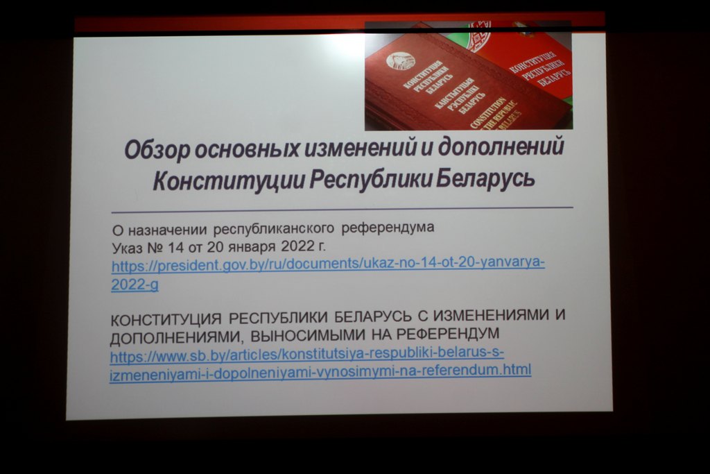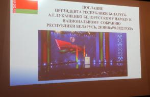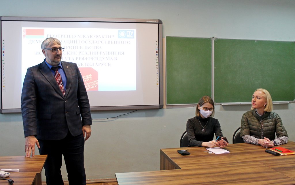 Татьяна Починок, заведующий кафедрой межкультурных коммуникаций и международного туризма, представила историю развития института референдума в Республике Беларусь, механизм его реализации, ключевые вопросы и итоги референдумов 1995 года, 1996 года и 2004 года, а также Программу патриотического воспитания населения на 2022 – 2025 годы. В выступлении уделено внимание Посланию Президента Республики Беларусь А.Г. Лукашенко белорусскому народу и Национальному собранию – тема единого дня информирования.