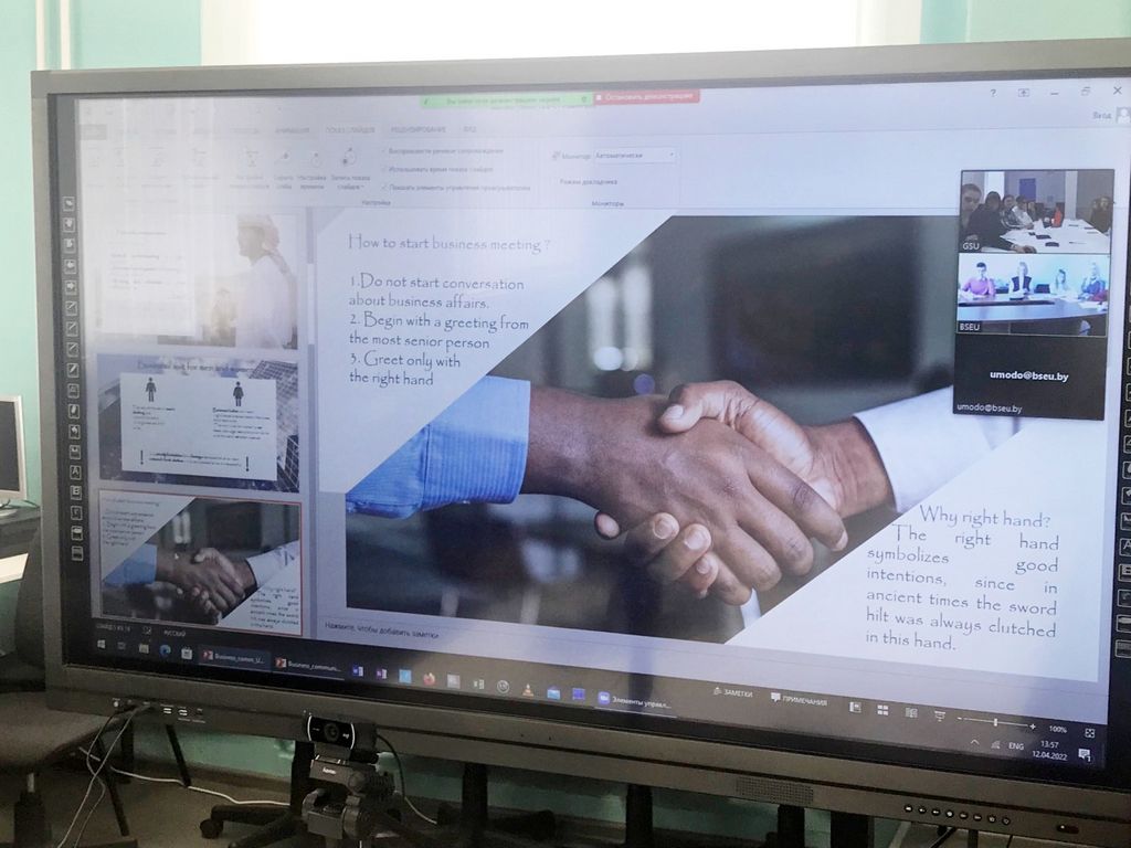 В контексте проведения мероприятия «Дни студенческой науки» студенты 1 курса специальности «Лингвистическое обеспечение межкультурных коммуникаций (международный туризм)» Гомельского государственного университета имени Ф. Скорины совместно со студентами 1 курса специальности «Бухгалтерский учет, анализ и аудит (в банках)» и специальности «Финансы и контроль в сфере таможенной деятельности» Белорусского государственного экономического университета приняли участие в онлайн-семинаре на английском языке по теме «Межкультурные особенности ведения деловых переговоров».