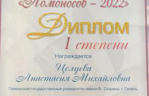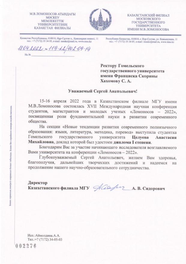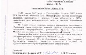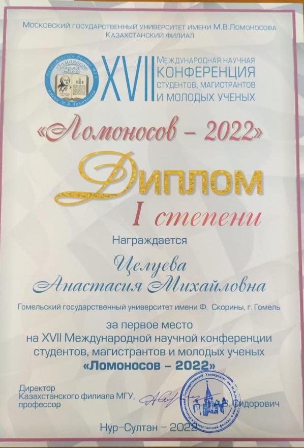 20 апреля 2022 в Казахстанском филиале МГУ имени М.В. Ломоносова состоялась XVII Международная конференция студентов, магистрантов и молодых ученых «Ломоносов -2022». К участию в онлайн формате подключилась и студентка 2 курса факультета иностранных языков Целуева Анастасия, которая с самого начала своего обучения на факультет проявила высокий потенциал в научной работе.