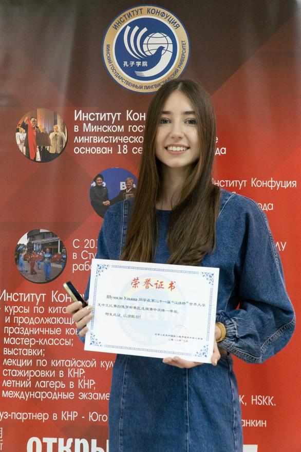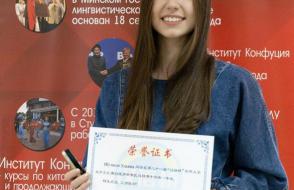 Победителем отборочных туров Всемирного конкурса по китайскому языку «Мост китайского языка» среди школьников стала Забродская Мария, слушатель Института Конфуция при Гомельском государственном университете им. Ф. Скорины (1 место). Мария изучает китайский язык в течение трех лет, ее преподавателем является Цзы Хэхэ, аспирант кафедры белорусской литературы нашего университета. Девушка представит Республику Беларусь в финале Всемирного конкурса по китайскому языку среди студентов «Китайский язык – мост».