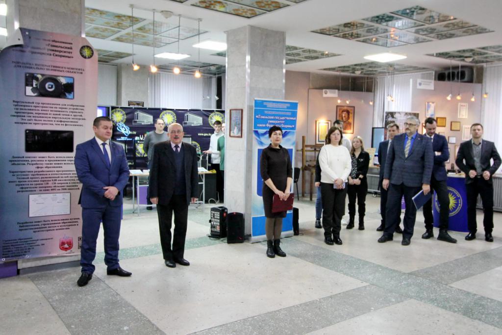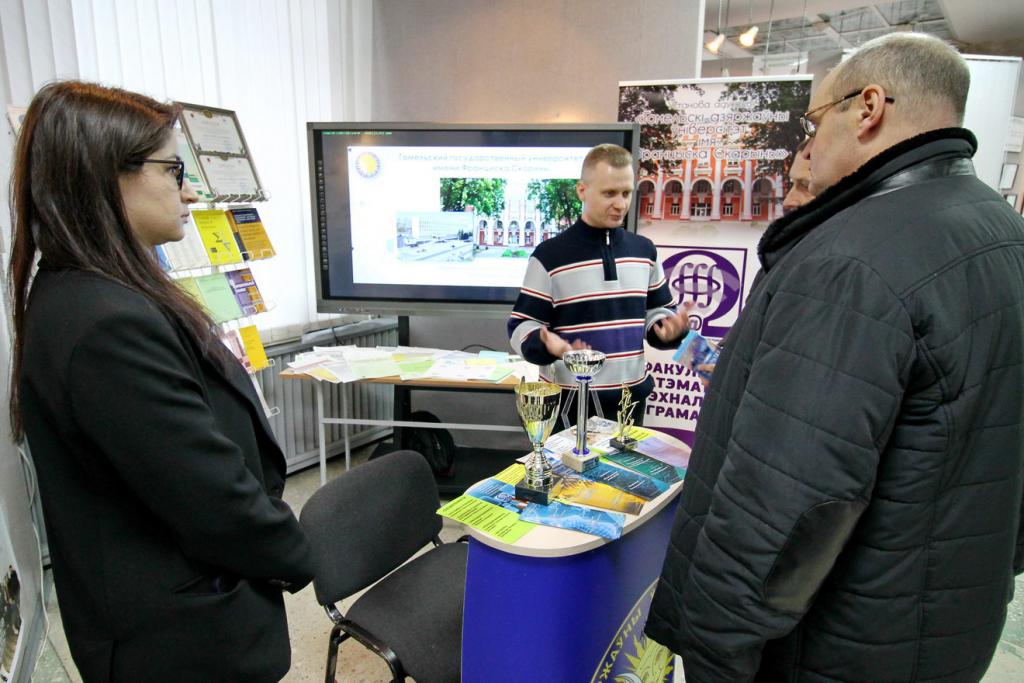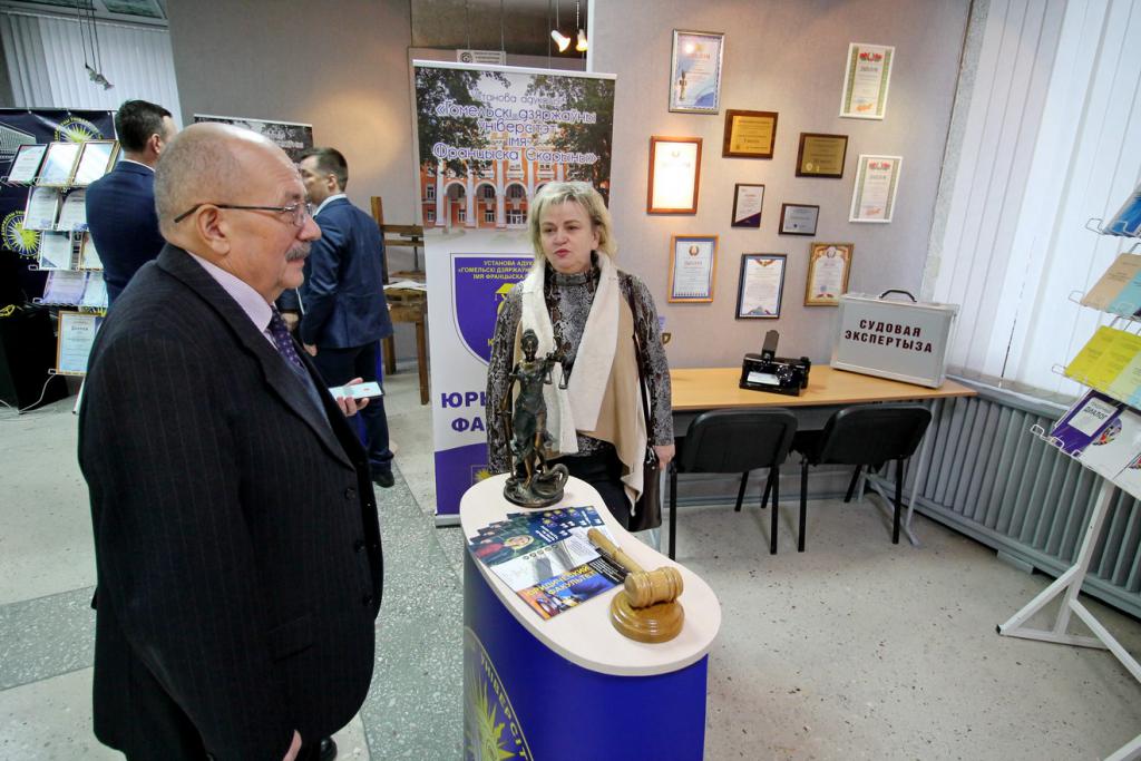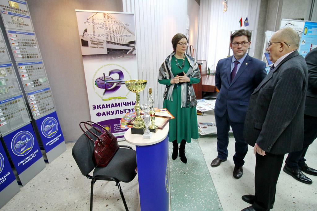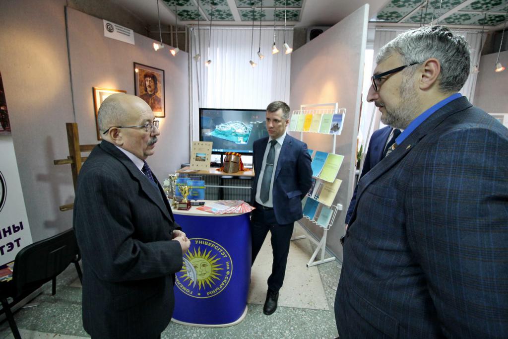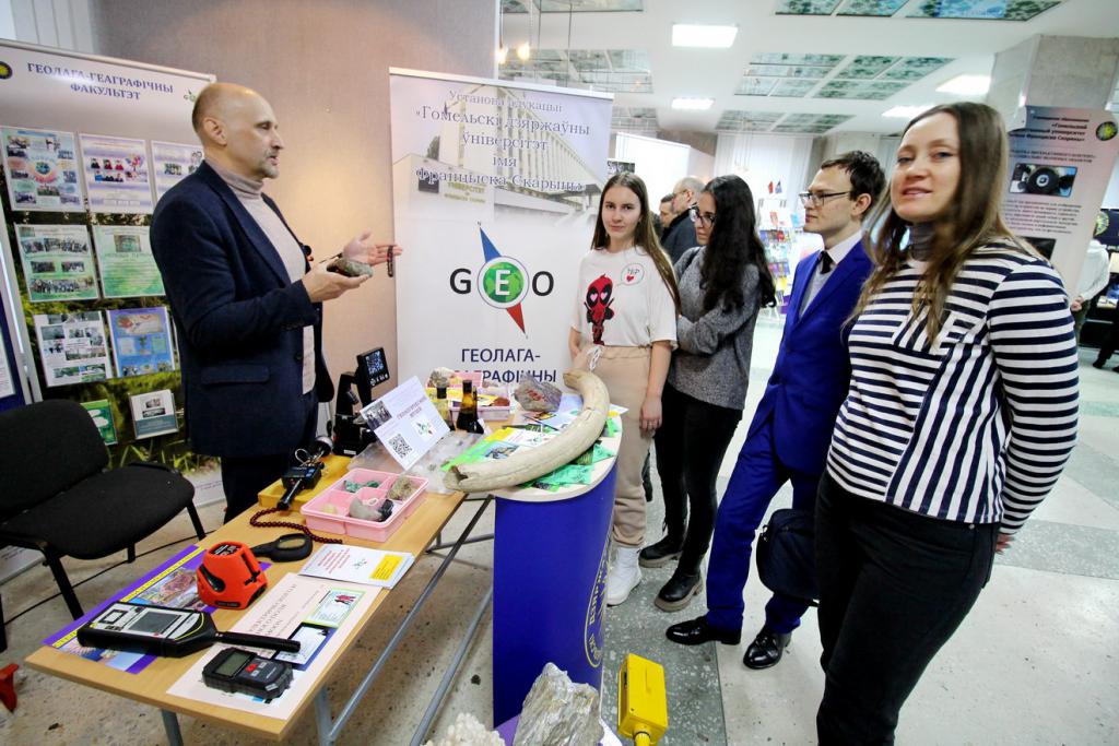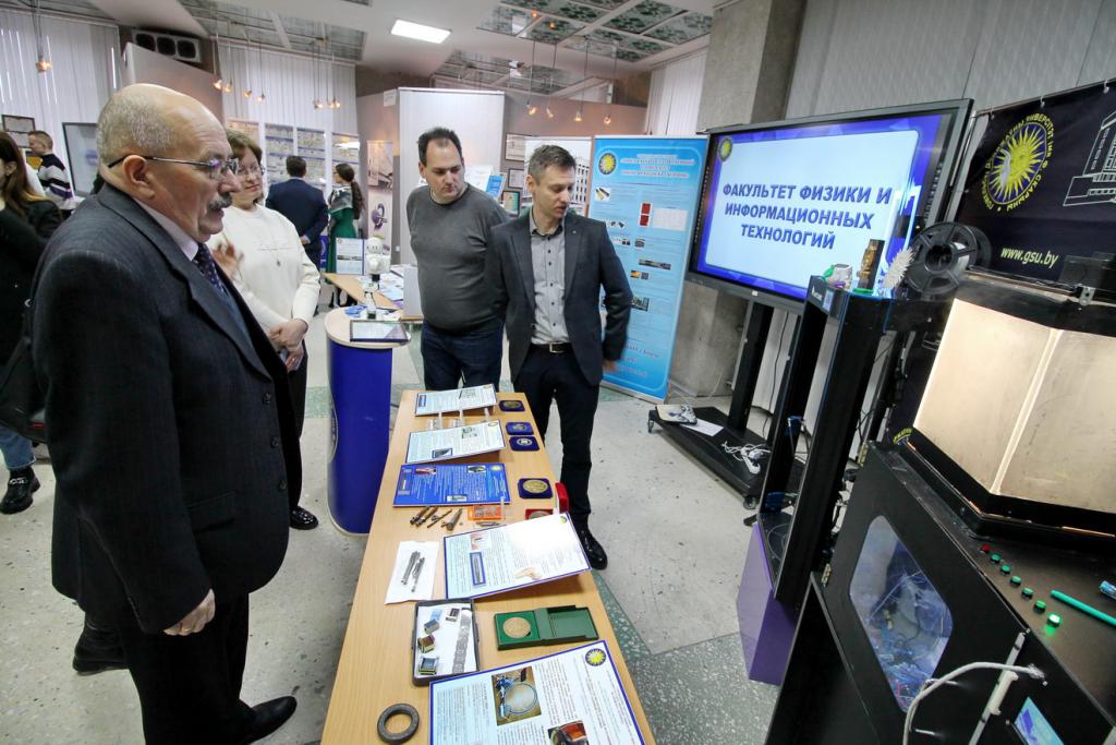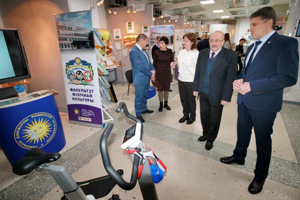 В экспозициях можно увидеть наиболее значимые научно-технические достижения университета и инновационной деятельности. Вот стенд факультета психологии и педагогики с интересным экспонатом для релаксации «Звездное небо», можно расслабиться и даже загадать желание во время падающей звезды. Это уверяют психологи, способствует сохранению и укреплению психофизического и эмоционального состояния здоровья. Рядом расположился геолого-географический факультет с мобильным приложением «Цифровой геологический музей», ультрафиолетовым детектором для проверки подлинности купюр и камней, станцией для мониторинга измерений геомагнитного поля, магнитных бурь. Представители факультета математики и технологий программирования расскажут про приложение для геолокации пациента и машины скорой медпомощи, а историки – про модель древнего Гомеля. Привлечет внимание робот факультета физики и информационных технологий, он умеет говорить, петь и танцевать, активно используется при профориентации, а также промышленный 3D-принтер, который напечатает различные объекты. Любопытная разработка студентов – «зеленый» компьютер – система, которая позволяет создавать и поддерживать определенную климатическую среду. Интерес вызовет факультет физической культуры с велоэргометром для исследования состояния спортсмена, приборами для определения скорости силовых качеств, биоимпендансного анализа состава тела человека.