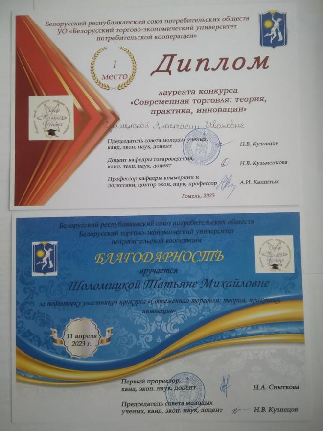 Первое место на конкурсе научных работ студентов и магистрантов «Современная торговля: теория, практика, инновации», организованном Советом молодых ученых Белорусского торгово-экономического университета потребительской кооперации, заняла студентка Гомельского государственного университета имени Франциска Скорины Анастасия Краменская.