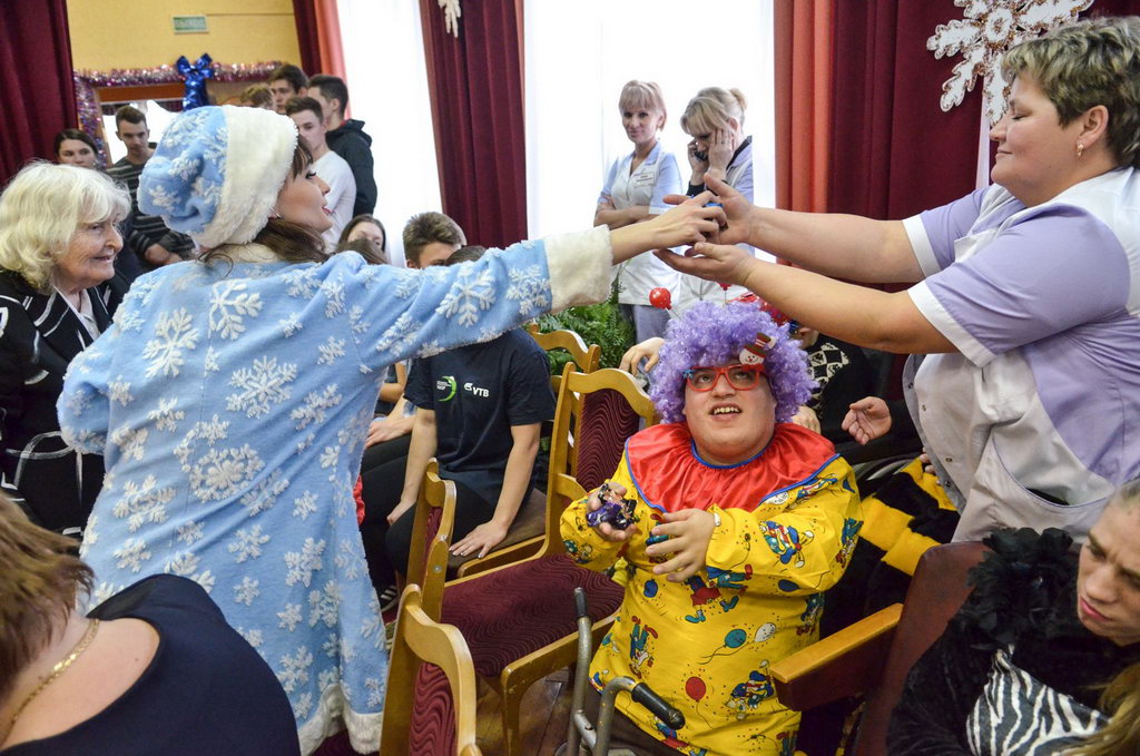 Детей, которых не было на ёлке, в палатах поздравили волонтеры факультета математики и технологий программирования: Дед Мороз – Леонов Максим (ЭК-21), Снегурочка – Терлецкая Екатерина (ПМ-31).