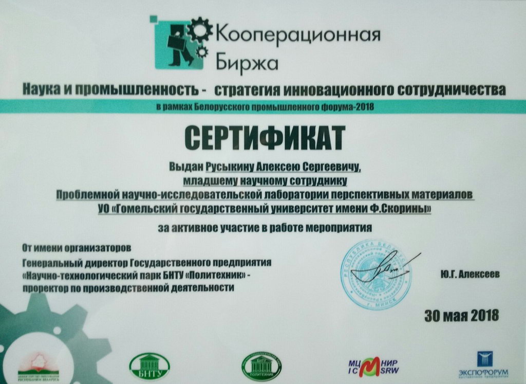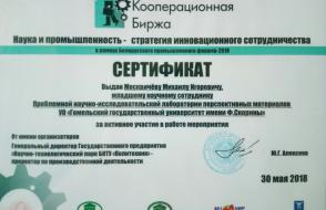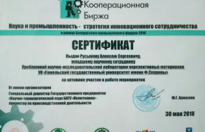 На форсайт-сессии был представлен доклад "Разработки в области перспективных материалов Гомельского государственного университета имени Ф. Скорины", а на интерактивных сессиях были представлены образцы пеностеклокерамических теплоизоляционных и радиозащитных материалов и термостойких ударопрочных золь-гель покрытий. Проведены деловые переговоры с заинтересованными представителями предприятий. За активное участие в работе мероприятия Москвичёв М.И. и Русыкин А.С. получили сертификаты от организаторов.
