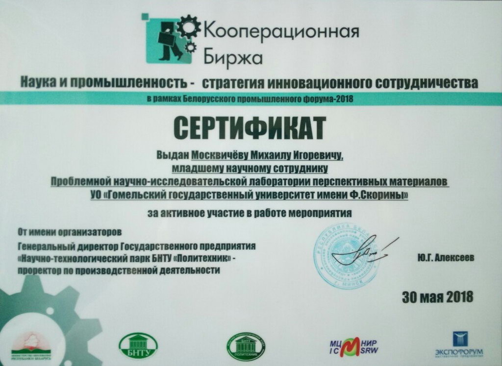 Сотрудники Проблемной научно-исследовательской лаборатории, аспиранты факультета физики и информационных технологий Москвичёв М.И. и Русыкин А.С. приняли участие в ярмарке инновационных разработок "Промышленность: от инновации до производства" и кооперационной бирже "Наука и промышленность - стратегия инновационного сотрудничества", проходящих в рамках Белорусского промышленного форума - 2018.