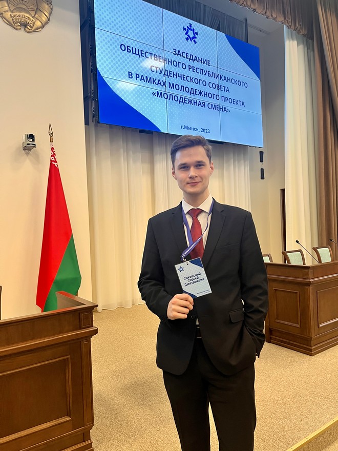 Участников, среди которых был и студент 4 курса факультета физики и ИТ Сергей Саковский, ждал открытый диалог с начальником главного управления воспитательной работы и молодежной политики Министерства образования Виктором Довнаром.