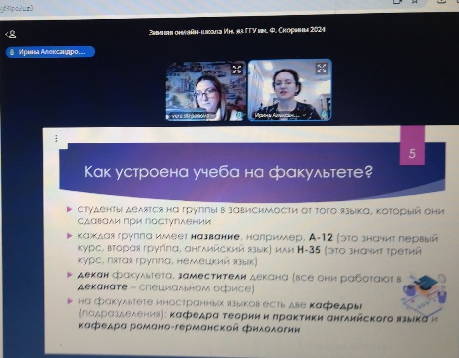 5 января 2024 года преподаватели факультета иностранных языковГомельского государственного университета имени Франциска Скорины впервые в истории факультета провели Зимнюю онлайн-школу «Ин.яз ГГУ имени Ф. Скорины 2024». В рамках онлайн-школы для учащихся 9-11 классов учреждений общего среднего образования города Гомеля были прочитаны лекции по языкознанию, литературоведению и переводоведению.