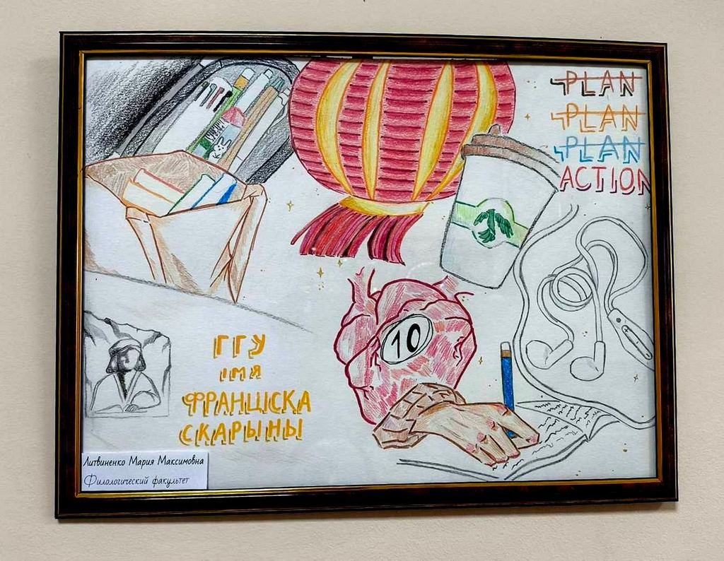 Вот, что говорит о своей картине Мария Литвиненко: "Я вдохновлялась своими буднями в университете и провела небольшой опрос у людей вокруг: студенты, преподаватели, заведующие кафедрой. Было много разных ответов, с чем ассоциируется у них университет, но чаще всего говорили именно эти фразы: "Наушники у ребят", "Конспекты лекций", "Сумки и пеналы для самого нужного" "Красный китайский фонарик или небесный фонарик, который ассоциируется с иностранными студентами", и, конечно же, "Главный корпус с изображением Франциска Скорины рядом с золотыми буквами университета".