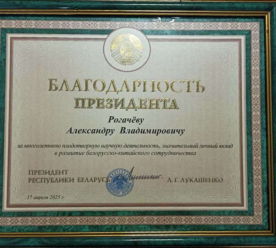 Директору Научно-исследовательского физико-химического института ГГУ имени Ф. Скорины Александру Рогачеву за многолетнюю плодотворную научную деятельность, значительный личный вклад в развитие белорусско-китайского сотрудничества объявлена Благодарность Президента.