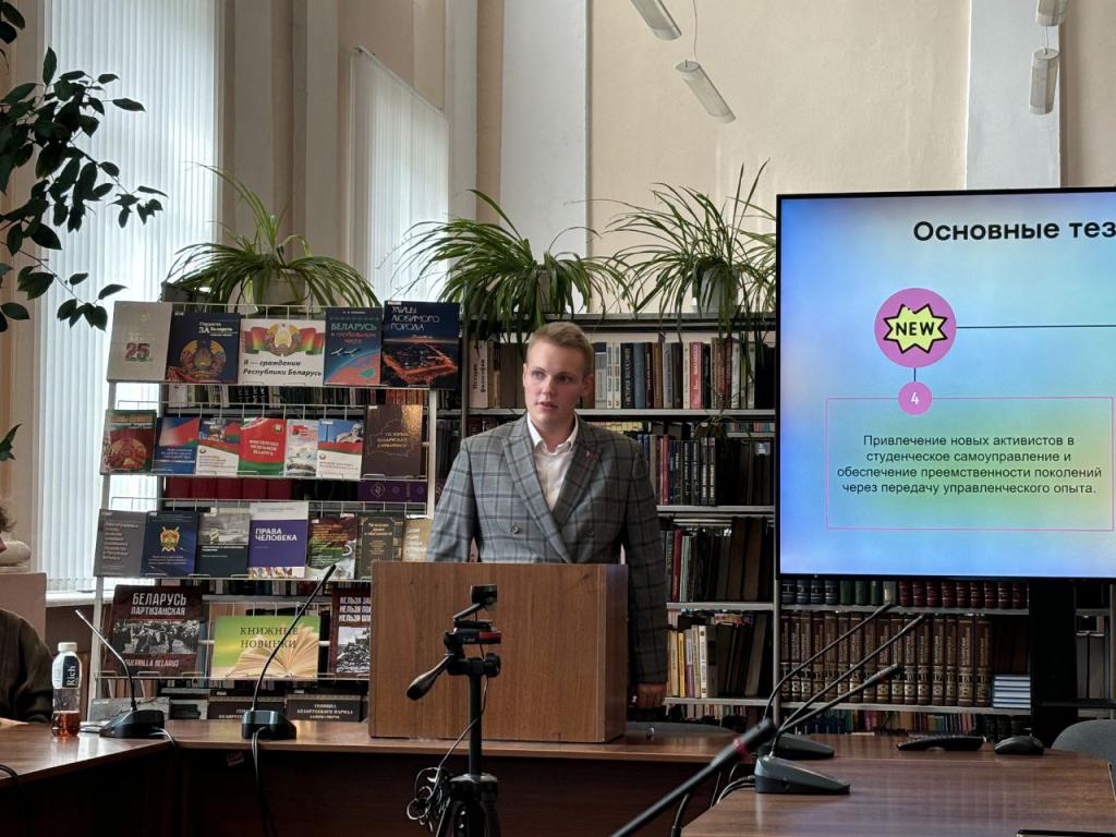 С напутственными словами перед членами Студсовета выступили член Молодежного совета при Совете Республики Национального собрания Республики Беларусь Сергей Саковский и экс-председатель Студенческого совета университета Михаил Конин.