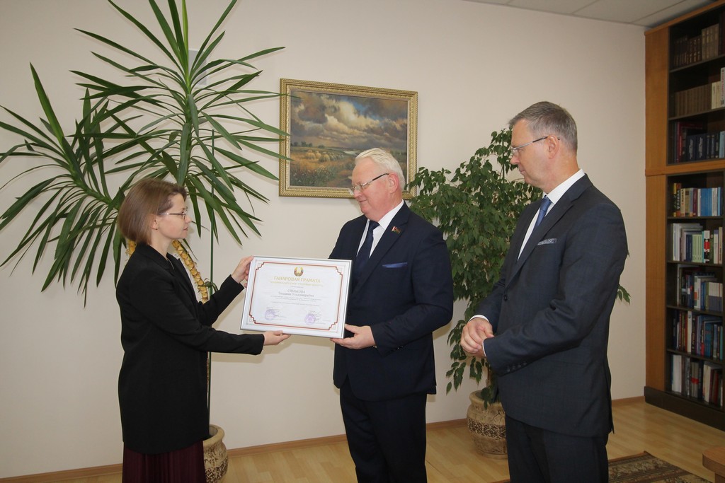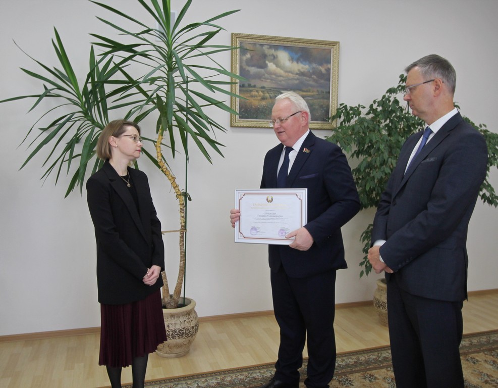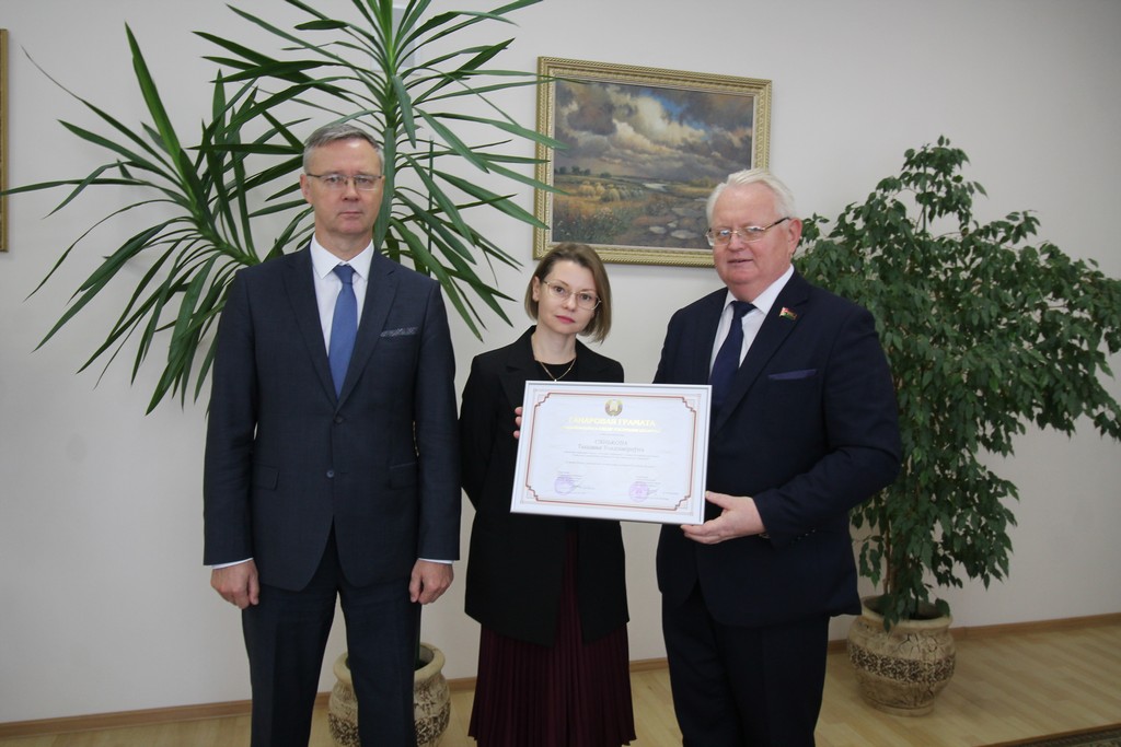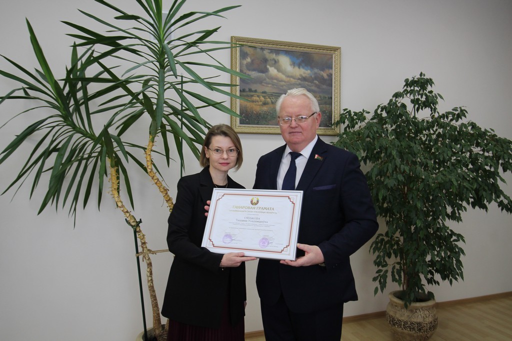 Ганаровай граматай Нацыянальнага сходу Рэспублікі Беларусь за вялікі уклад у рэалізацыю сацыяльнай палітыкі узнагароджана загадчык кафедры тэорыі і гісторыі дзяржавы і права ўстановы адукацыі «Гомельскі дзяржаўны ўніверсітэт імя Францыска Скарыны» Таццяна Сянькова.