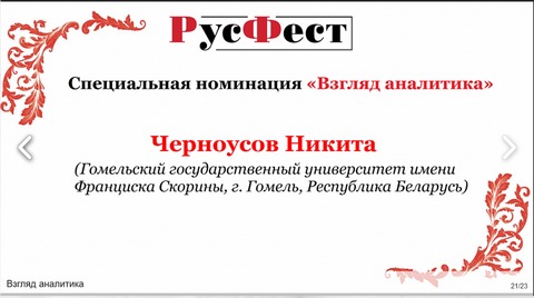 盛会的结果于 2023 年 2 月 7 日公布。 RI-31组的学生阿纳斯塔西娅·科普尼诺娃(Anastasia Kopninova)成为“文字统治世界”提名的获胜者。 Chernousov Nikita(RF-21 组)成为“分析师观点”特别提名的获胜者。