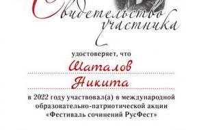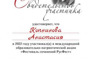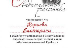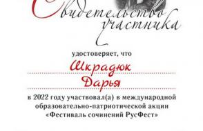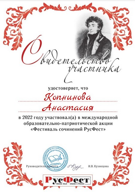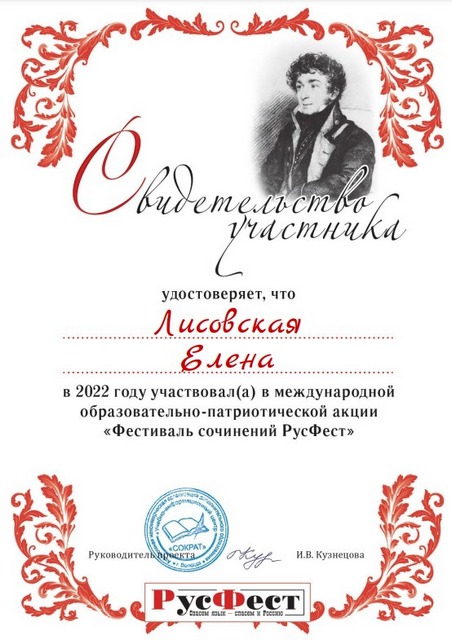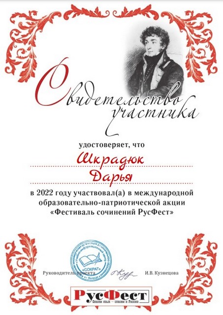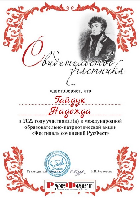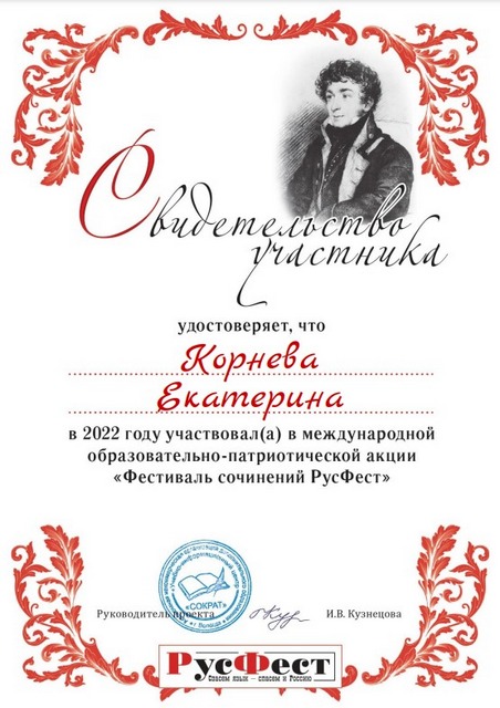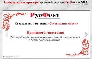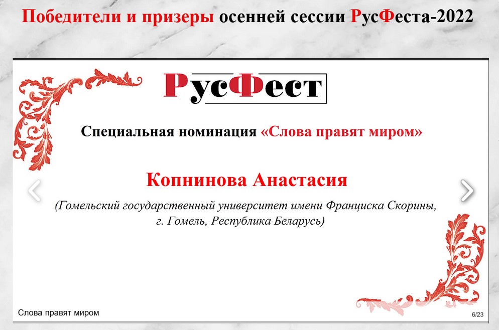 2022 年 10 月,语言学系 1-3 门课程的 10 名学生(Gayduk Nadezhda、Kopninova Anastasia、Shatalov Nikita、Chernousov Nikita、Shkradyuk Daria、Gnedko Oksana、Tkachenko Anna、Korneva Ekaterina、Elena Lisovskaya 和 Ksenia Shikhalova)成为参与者一年一度的国际教育秋季会议 - 教育行动“论文节 RusFest”,学生们在其中写了一篇关于给定主题的论文。 行动的所有参与者都获得了证书。