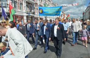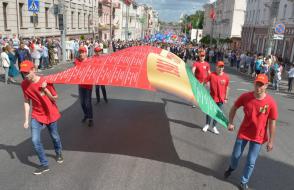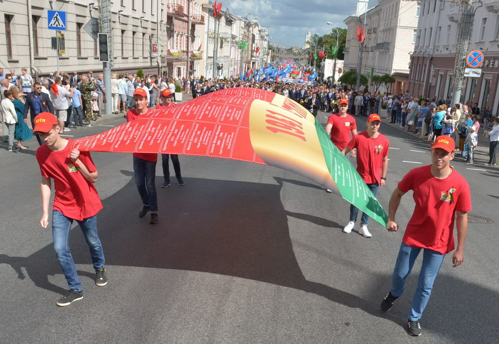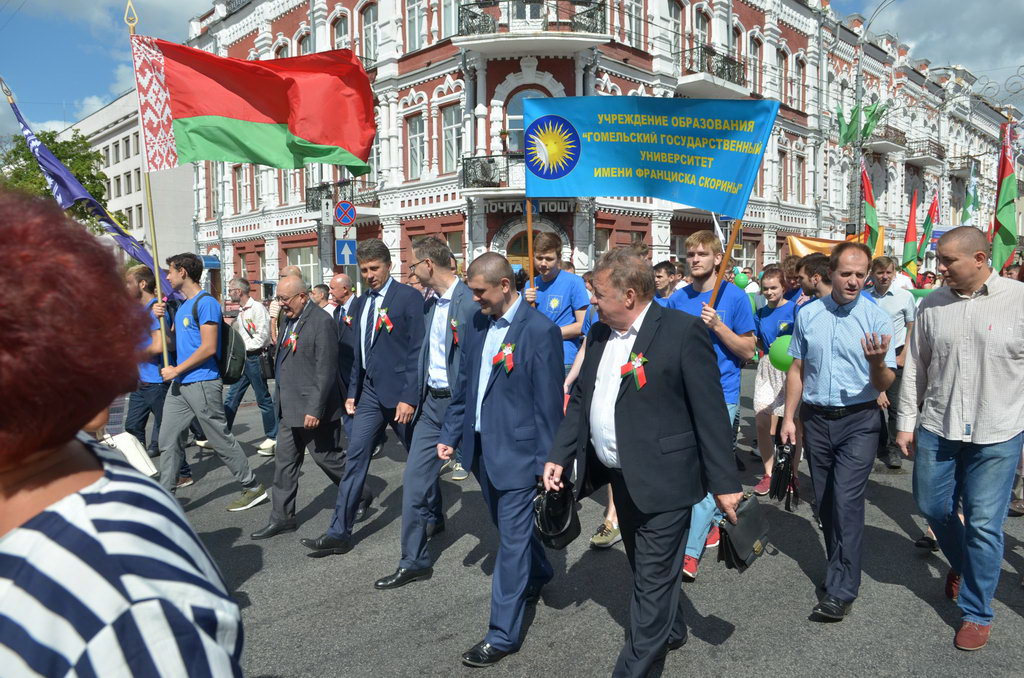 Традиционно празднование 3 июля началось с торжественного шествия.  В 10 утра колонна представителей различных организаций Гомеля, юноши и девушки, ветераны прошлись по всему историческому центру города, завершив свой путь на площади Труда, где состоялось  возложение венков и цветов.