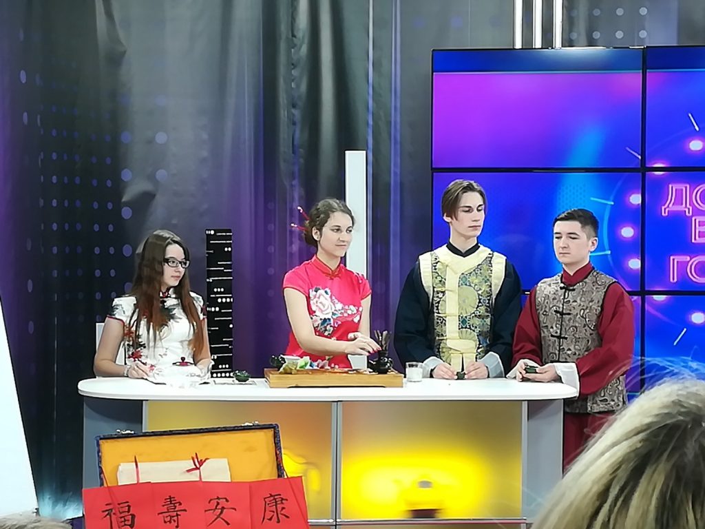 Завершилась передача проведением китайской чайной церемонии, с премудростями которой вполне освоились студентки филологического факультета Ангелина Аксенчикова и Виолетта Белодед, которые в прошлом учебном году прошли обучение китайскому языку в летних школах университетов в городах Далянь и Шанхай.