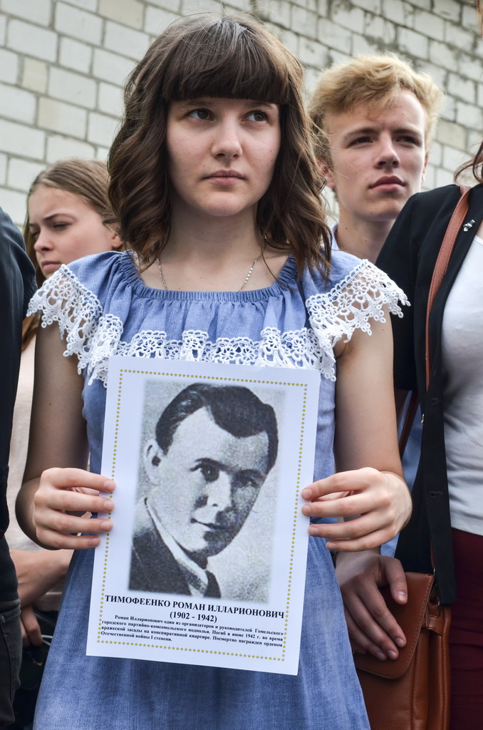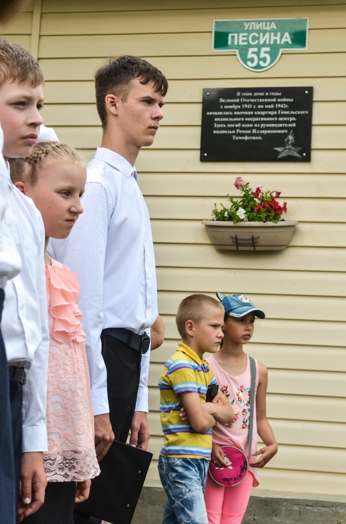 На торжественном мероприятии присутствовали депутат Гомельского областного Совета депутатов 28 созыва Сергей Анатольевич Хахомов, дети гомельских подпольщиков, в том числе сын Романа Иллирионовича Тимофеенко Ростислав Романович, ветераны Великой Отечественной войны, начальник управления идеологической работы, культуры и по делам молодежи Екатерина Викторовна Дегтярева, ученики гимназии № 56 и студенты университета.