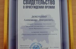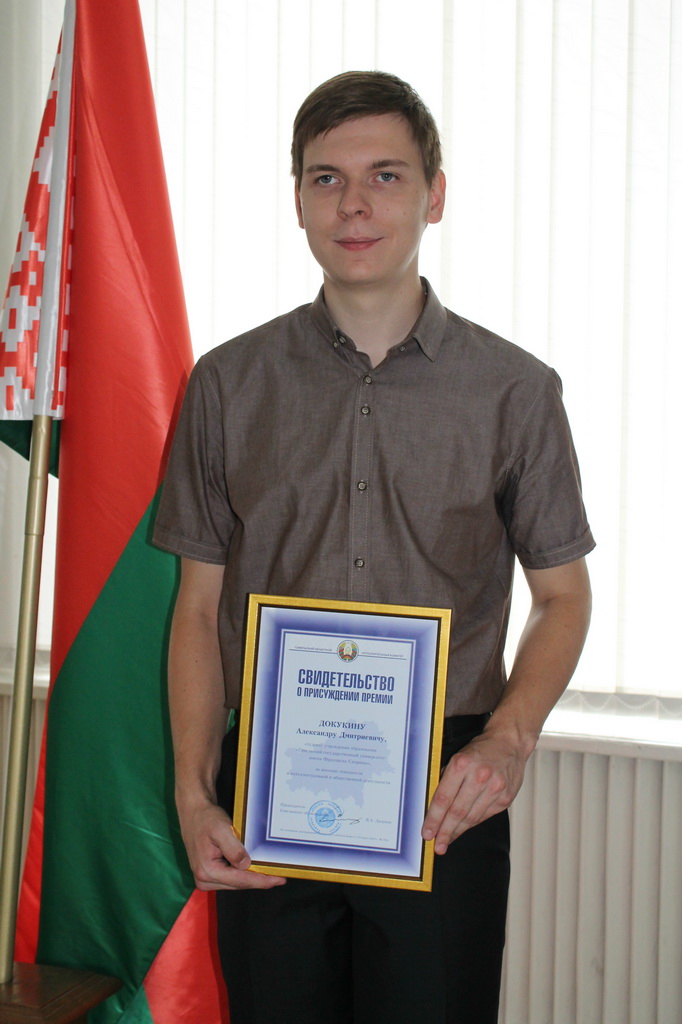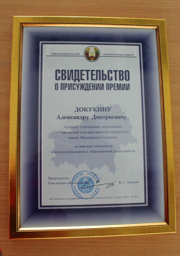 Студенту филологического факультета ГГУ имени Ф. Скорины Александру Докукину было вручено свидетельство о присуждении премии за высокие показатели в интеллектуальной и общественной деятельности.