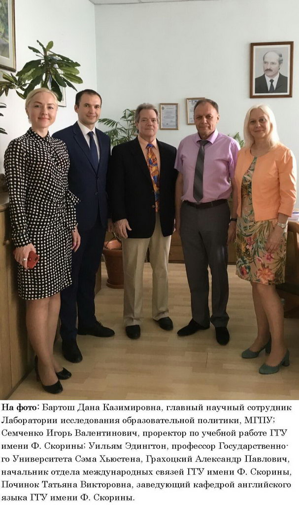 Одним из значимых результатов проведения с 16 по 18 мая в университете III Международного Фестиваля социальной рекламы «Ясный взгляд» в сотрудничестве с Московским городским педагогическим университетом явилось участие в мероприятиях Фестиваля Уильяма Эдингтона, профессора Департамента образовательных программ Государственного университета Сэма Хьюстона (штат Техас, США). Участие американского профессора состоялось при содействии коллег Лаборатории исследования образовательной политики Управления стратегического развития МГПУ, с которой налажены давние и плодотворные связи. В результате трехсторонних переговоров между российским, белорусским и американским вузами, наметились договоренности о трехсторонней совместной деятельности, а также состоялось подписание договора о сотрудничестве между Гомельским государственным университетом имени Ф. Скорины и Государственным университетом Сэма Хьюстена, США.