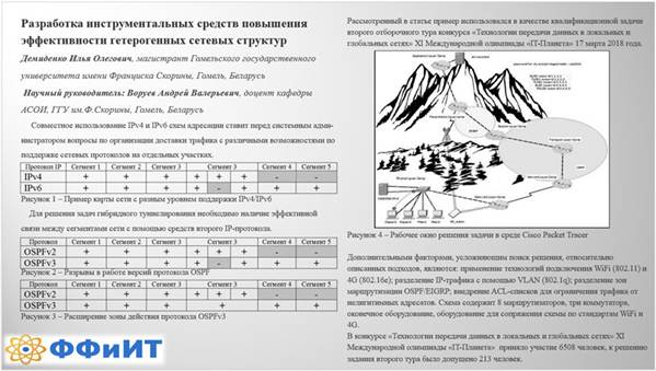 Студенты, магистранты и аспиранты нашего вуза приготовили и представили на мероприятии свои доклады на темы, касающиеся архитектуры программного инструментария по обеспечению безопасности узла ЛВС, разработки инструментальных средств повышения эффективности гетерогенных сетевых структур, статистики перехода к использованию IPv6, требований к частотам передачи данных волоконнооптических систем, разработки концептуальной модели управления системой лифтов в многоэтажном здании и др.