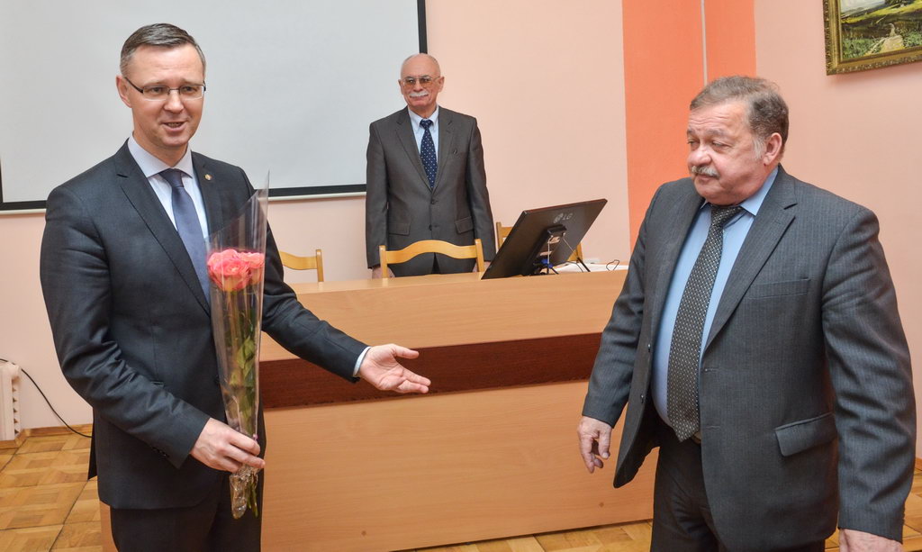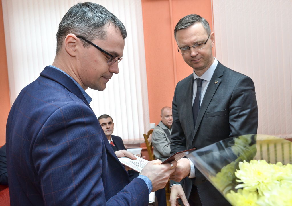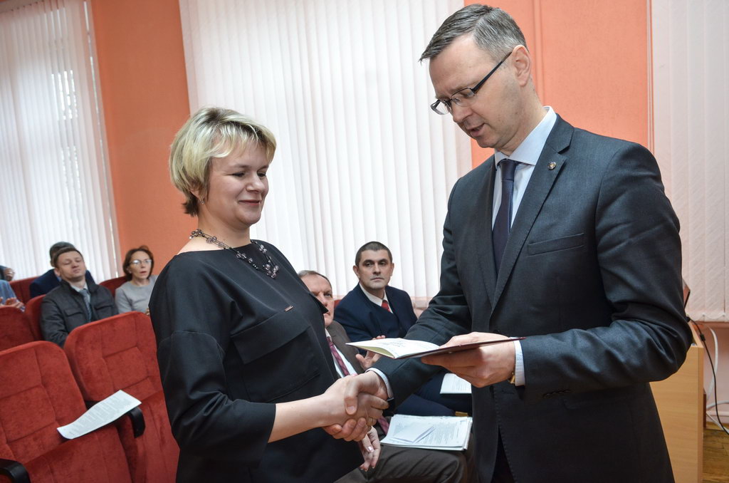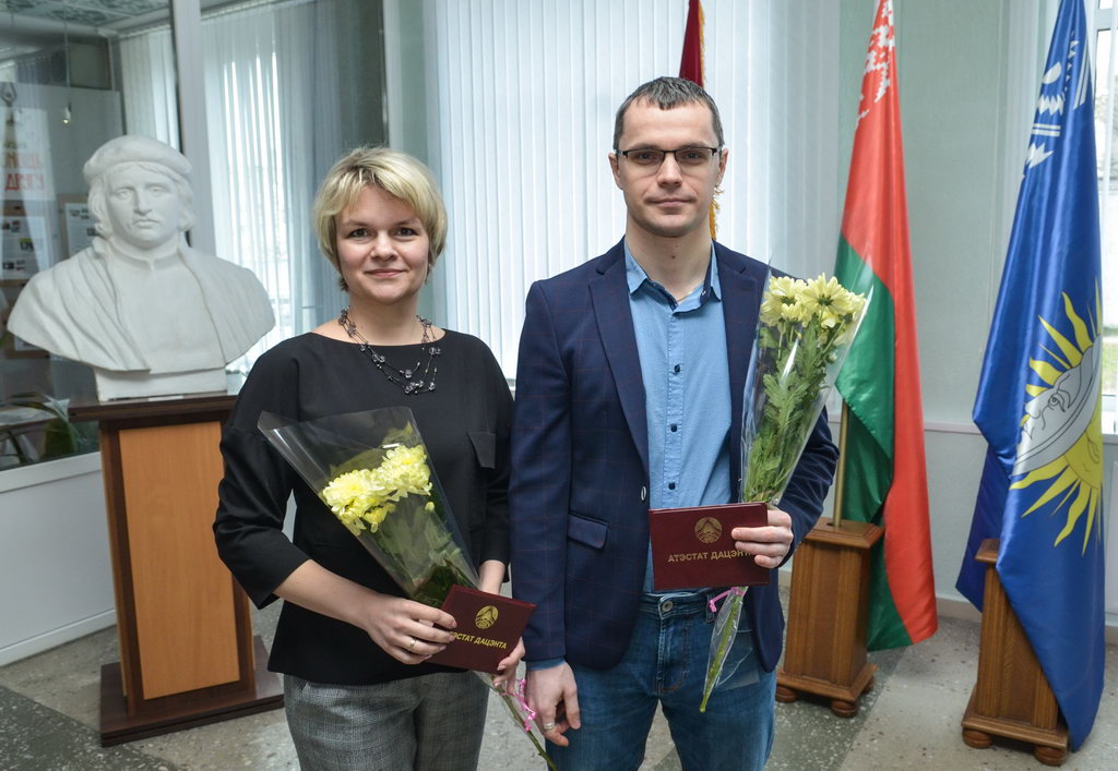 Мартовское заседание Совета университета открылось торжественной церемонией вручения наград работникам ГГУ имени Ф. Скорины. Аттестаты доцента из рук ректора Сергея Хахомова получили кандидат технических наук, доцент Александр Руденков и кандидат психологических наук, доцент Наталья Новак. За многолетнюю плодотворную работу в учреждении образования Почетной грамотой университета награждена заместитель заведующего общежитием №4 Татьяна Денисова.