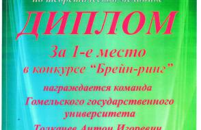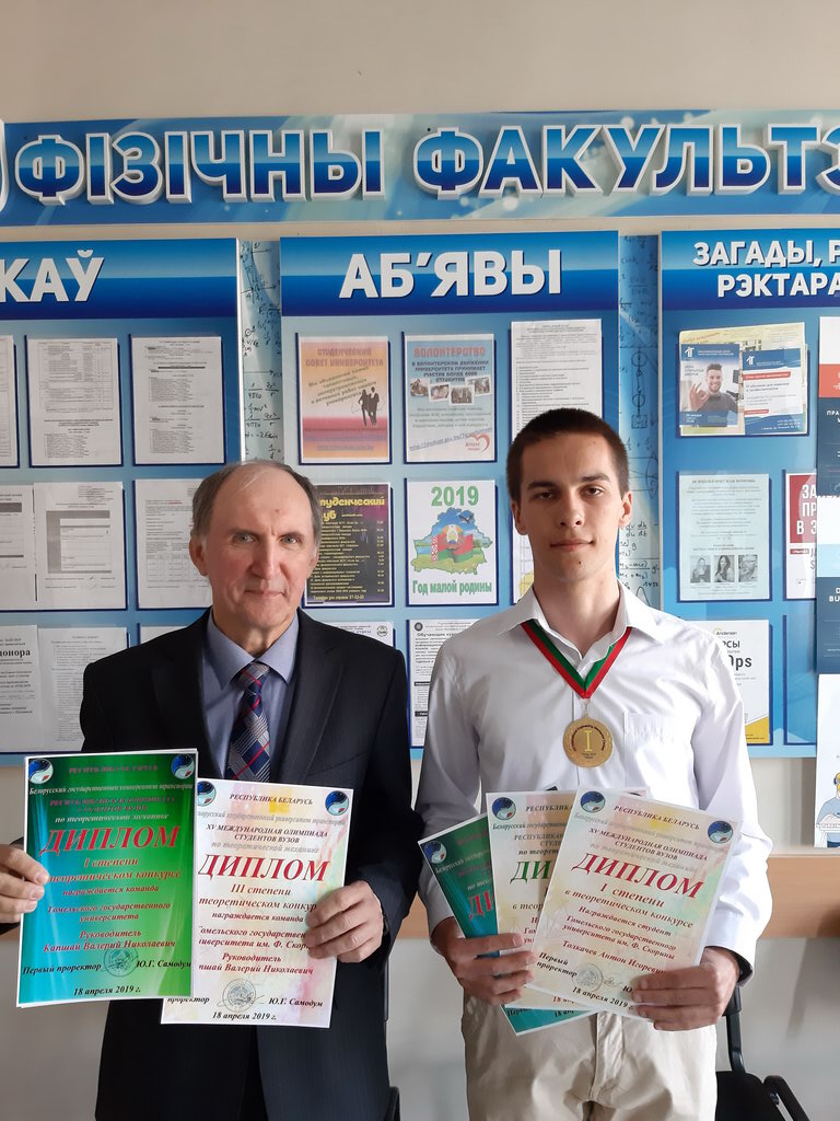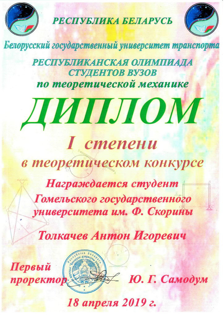 Все перечисленные выше команды стали дипломантами конкурса в командном зачете. Второй лучшей из команд, получивших дипломы третьей степени, стала команда ГГУ им. Ф. Скорины в составе Антона Толкачёва, Андрея Бужана и Андрея Павленко, набравших в сумме 131 балл. При этом наибольший вклад в этот результат внес Антон Толкачёв, показавший феноменальный результат: 75 баллов из 80 потенциально возможных. Антон опередил почти 150 участников – и у жюри не было сомнений в том, кого награждать золотой медалью и ценным призом. Успех этого года особенно ценен ещё и потому, что два предыдущих года Антон останавливался в 1-2 баллах от золотой медали, а также потому, что в следующем году он уже не будет студентом и сможет участвовать в этом соревновании только вне конкурса. Таким образом, за три последних года Антон Толкачёв заслужил на Международной олимпиаде по теоретической механике золотую и две серебряных медали.