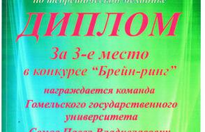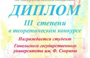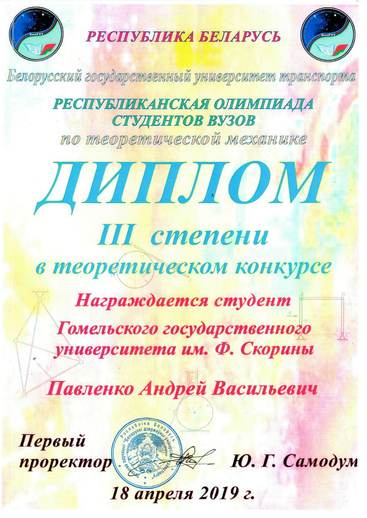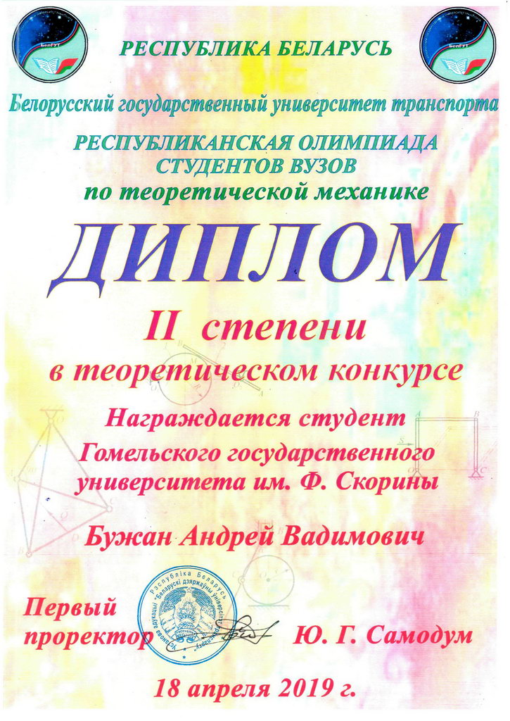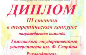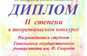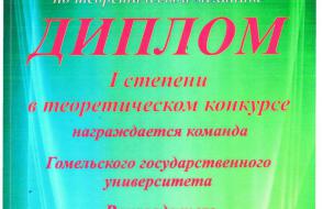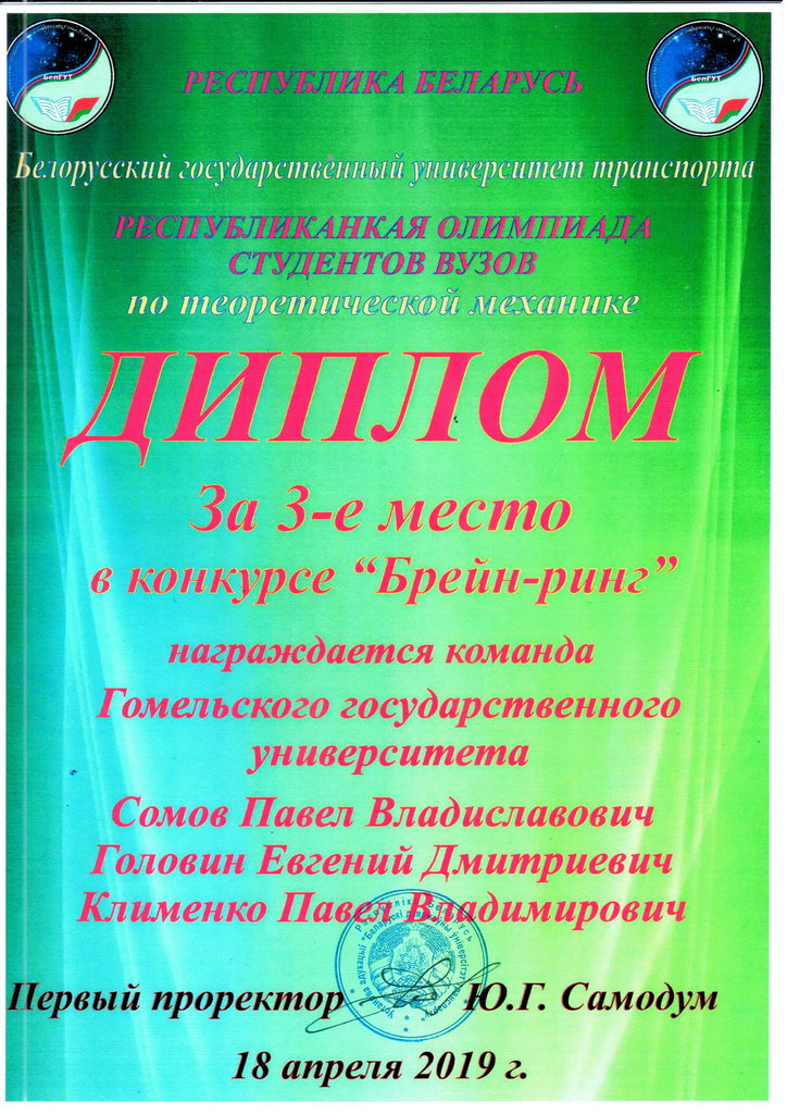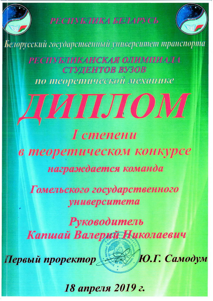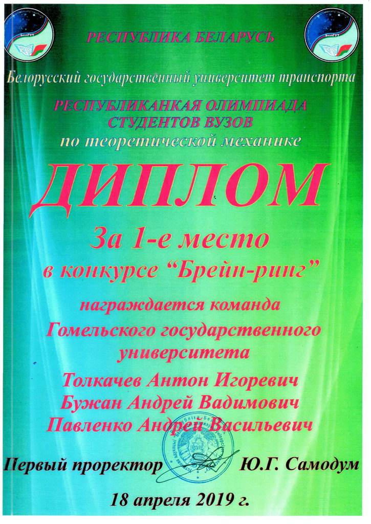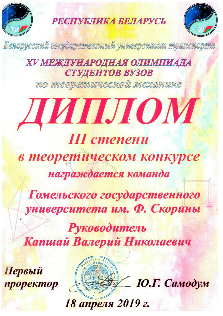 Были также подведены итоги Республиканской олимпиады по теоретической механике. В этом соревновании наши участники А. Толкачёв, А. Бужан и А. Павленко показали три лучших личных результата, а команда ГГУ им. Ф. Скорины уверенно заняла первое место в командном зачёте, а также еще в одном соревновании – Брейн-ринге (конкурсе решения коротких задач). Этих успехов команда добивается уже третий год подряд.