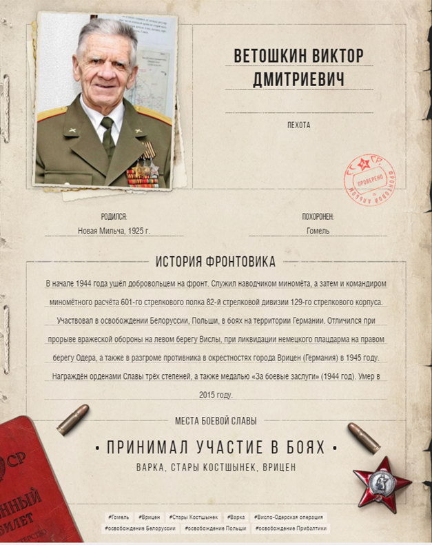 По решению конкурсной комиссии материал доцента кафедры химии Татьяны Макаренко и студента второго курса биологического факультета Антона Кошеля о ветеране Великой Отечественной войны Федоре Шишкове размещены на страницах газеты «7 дней» №20 от 16.05.2019 г. Работы ассистента кафедры педагогики Надежды Зенько и второкурсницы биологического факультета Татьяны Куропаткиной размещены на официальном сайте газеты www.7dney.by  в разделе «Фронтовой альбом».