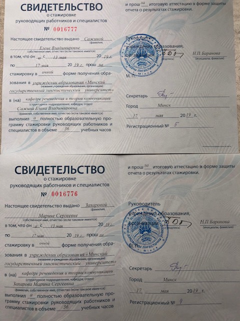Выражаем искреннюю благодарность за тесное и плодотворное сотрудничество ректору Минского государственного лингвистического университета Н.П. Барановой, директору Института повышения квалификации и переподготовки кадров Минского государственного лингвистического университета Л.А.Тригубовой, заведующему кафедрой речеведения и теории коммуникации Т.В. Поплавской, а также всем сотрудникам и преподавателям, которые делились своим бесценным опытом во время нашей стажировки.