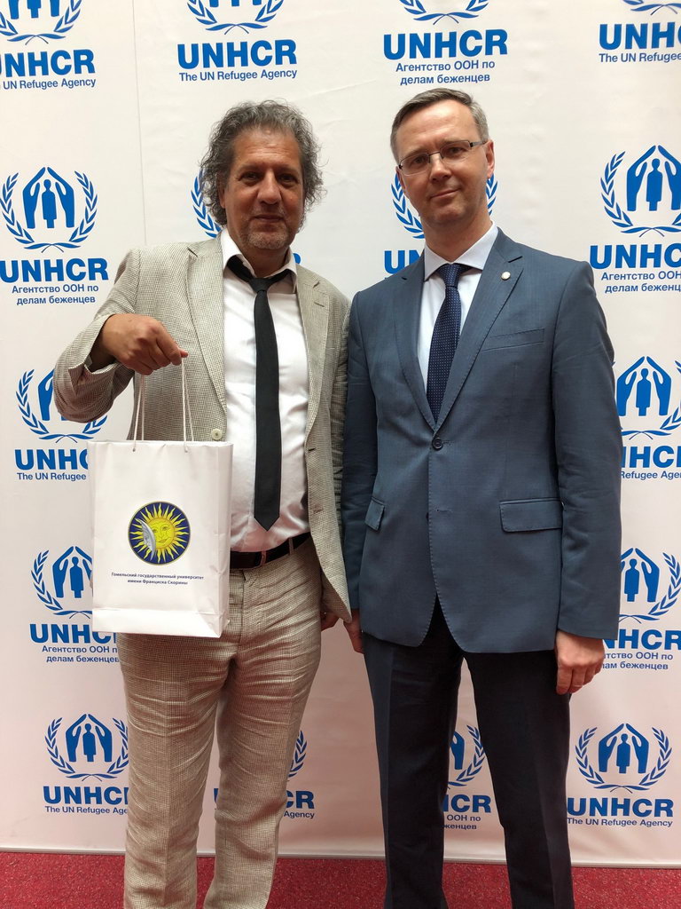 В рамках Всемирного Дня беженцев ректор Гомельского государственного университета имени Ф. Скорины Сергей Хахомов и проректор по научной работе Олег Демиденко посетили Представительство Управления Верховного Комиссара ООН по делам беженцев в Республике Беларусь. На мероприятии собрались представители ООН, работники социальной сферы, дипломаты, лица, находящиеся в компетенции УВКБ ООН.