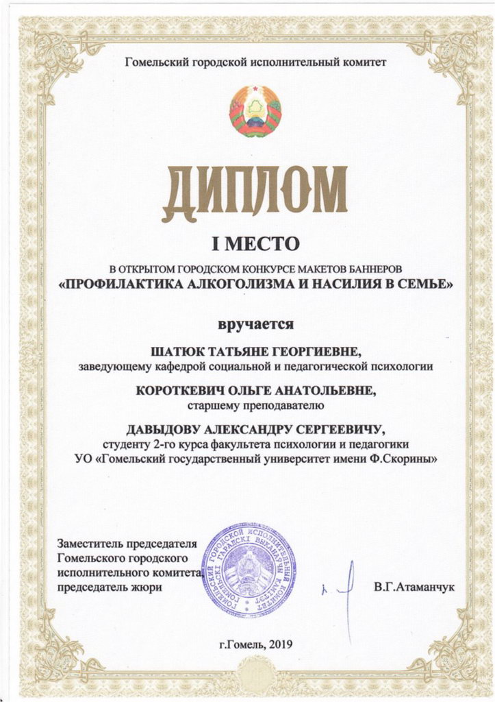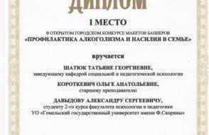 Творческий коллектив кафедры социальной и педагогической психологии в составе заведующего кафедрой Татьяны Шатюк, старшего преподавателя Ольги Короткевич, студента специальности «Социальная работа» (социально-психологическая деятельность) Александра Давыдова принимал участие в открытом городском конкурсе макетов баннеров «Профилактика алкоголизма и насилия в семье», организованном совместными усилиями Гомельского горисполкома и УВД Гомельского облисполкома.