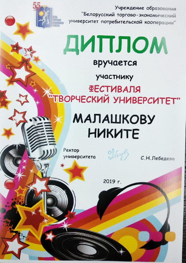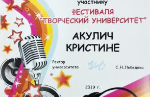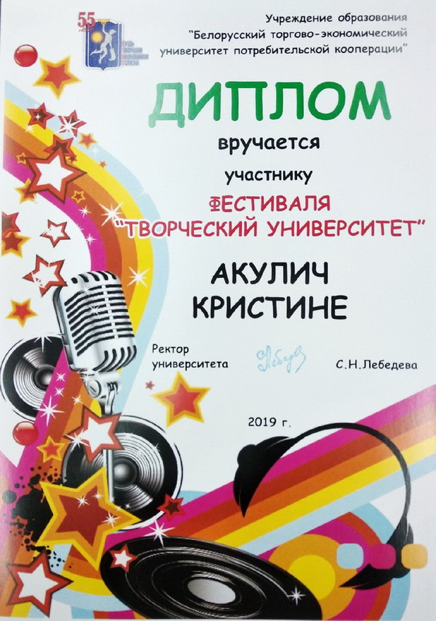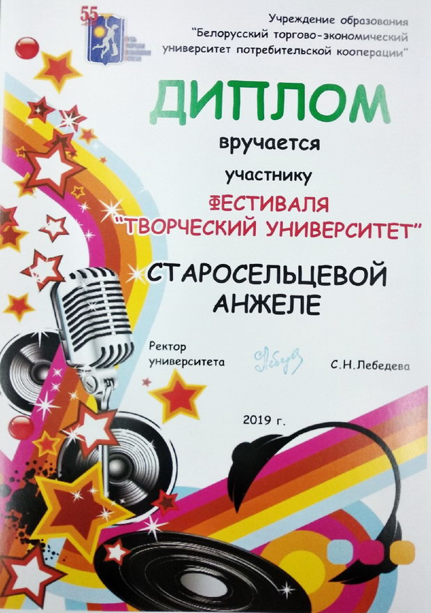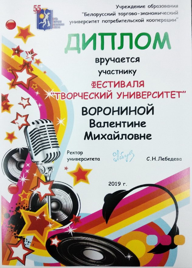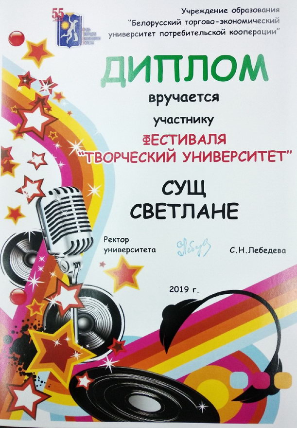 Дипломы участника были вручены хормейстеру Анжеле Старосельцевой, режиссеру Валентине Ворониной, а также студенту филологического факультета Никите Малашкову и студенткам экономического факультета Светлане Сущ и Кристине Акулич.