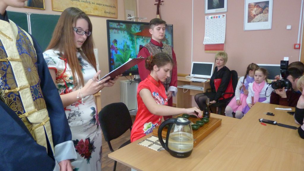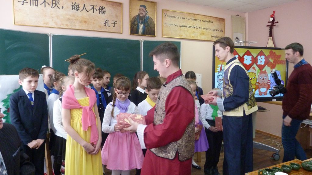 Успешно изучающие и уже неплохо «освоившие» китайский язык студентки 2 курса филологического факультета Ангелина Аксенчикова и Виолетта Белодед, одетые в красивые китайские платья,  рассказали о традициях китайского Нового года, после чего присутствовавшие увидели видеофильм на эту же тему. Особенно тепло были встречены гимназисты и школьники, которые на китайском языке пели песни, читали стихи и рассказывали диалоги. Студенты-филологи Никита  Малашков и Антон Ковалев, облаченные в китайские мужские костюмы, подарили юным китаистам сувениры в традиционных конвертиках красного цвета. Преподаватели кафедры русского, общего и славянского языкознания В.И. Коваль и Т.А. Осипова прочли стихи, а А.Г. Суколен исполнила популярную китайскую песню; китайский студент  3 курса Пан Фэн спел под аккомпанемент на гитаре  песню, а его товарищ Ван Фэйфань прочел стихи. Большой интерес у всех присутствующих вызвала китайская чайная церемония, которую с увлечением продемонстрировали Ангелина Аксенчикова и Виолетта Белодед. Магистрант-филолог Лю Фань подробнго рассказал о правилах пользования куай цзы – палочками для еды. Это было вполне логично и уместно, потому что в завершение праздника китайские студенты предложили для дегустации приготовленные ими настоящие китайские пельмени – цяо цзы, без которых не обходится Новый год в Поднебесной. Вкусовые достоинства китайских пельменей были незамедлительно оценены присутствующими.