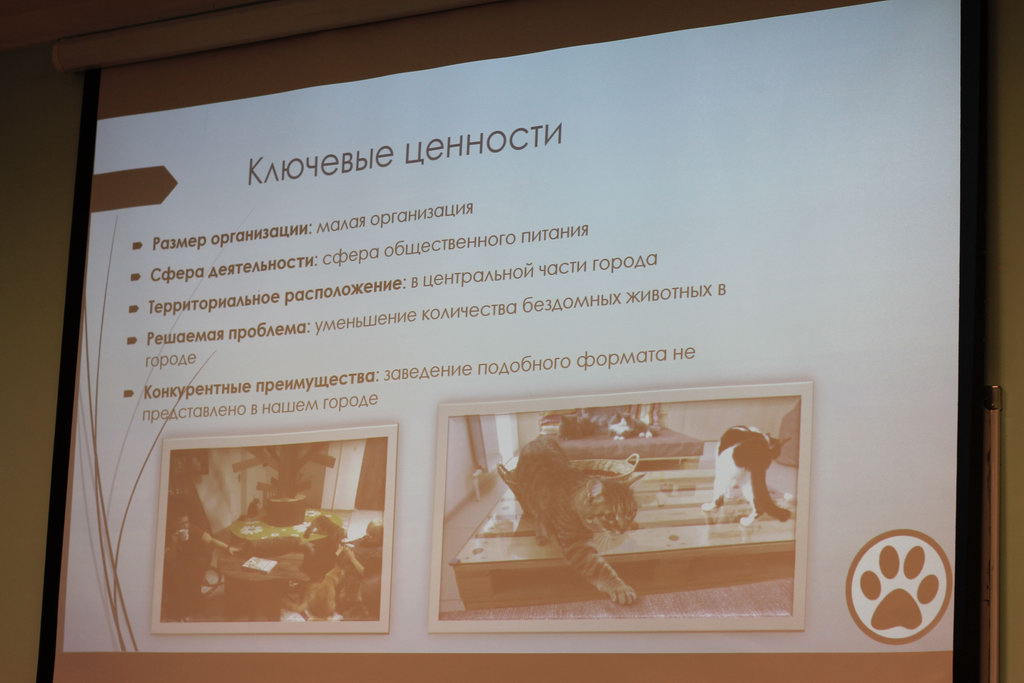 Номинации «Лучшее обоснование проекта» и «Лучшая презентация проекта» получил проект Котокафе, подготовленный учащимися 11 класса гимназии №10 г. Гомеля и презентованный Смоляковой Екатериной, Сильченко Сергеем, Спыну Евгенией. Идея Котокафе – это открытие заведения с повременной оплатой, где посетителям предоставляется возможность проводить свое свободное время с кошками. Удачным оказался и логотип проекта, который представляет собой отпечаток кошачей лапки. Ребята в ходе дискуссии смогли ответить на множество вопросов, которые задавали все участники, продемонстрировав всестороннее изучение вопроса. При этом о котах говорилось только в превосходной форме – величественные, элегантные… В заключении удалось протестировать идею котокафе на предмет ее востребованности – больше половины участников изъявили желание посетить такое антикафе.