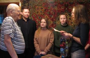 С теплыми пожеланиями к Михаилу Дмитриевичу обратились председатель Совета ветеранов Светлана Пантелеева и руководитель волонтерского отряда «Созвездие» Надежда Зенько, также они вручили ветерану благодарственное письмо и памятные подарки. Одна из студенток прочла для Михаила Дмитриевича стихотворение.
