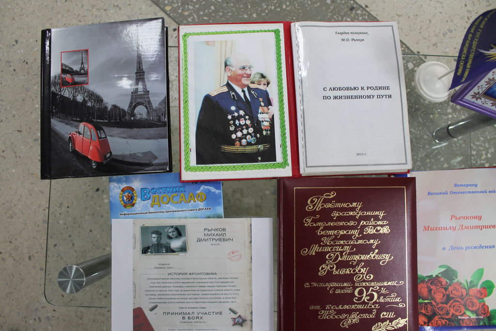 Михаил Дмитриевич совсем недавно отметил свой 96-й день рождения. Имея за плечами богатый жизненный опыт, он всегда с горечью вспоминает страшные годы войны. Михаил Рычков рассказал молодому поколению о своем боевом пути, вспомнил мобилизацию и первый день на фронте. В ходе беседы немаловажную роль сыграли автобиографические материалы Михаила Дмитриевича, фотоальбомы, награды, публикации о нем в СМИ.