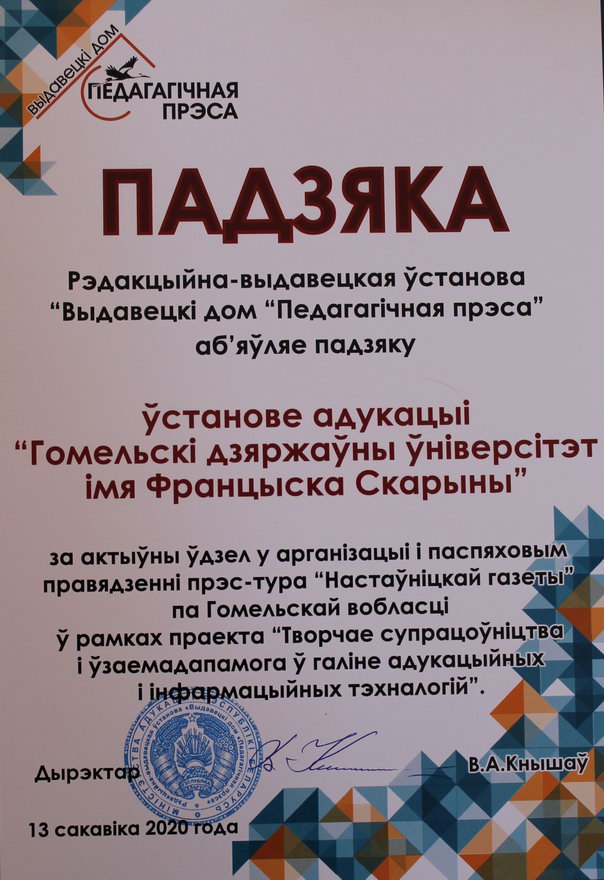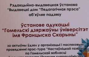 В рамках проекта «Творческое сотрудничество и взаимопомощь в сфере образовательных и информационных технологий» ГГУ имени Ф. Скорины посетили участники пресс-тура «Настаўніцкай газеты» по Гомельской области. Делегацию в составе известных журналистов возглавил директор Издательского дома «Педагогическая пресса», главный редактор Вадим Кнышев. На мероприятии присутствовал начальник главного управления образования Гомельского облисполкома Руслан Смирнов.