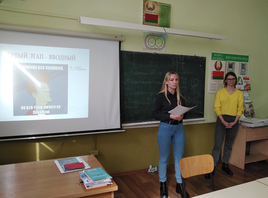 11 марта актив студенческой образовательной клиники «Живое право» (Анастасия Яркова, Ксения Ибрагимова, Анастасия Жукова) провел серию тренингов на правовую тематику в СШ №3 г. Добруша. В них приняли участие учащиеся 8-10 классов.