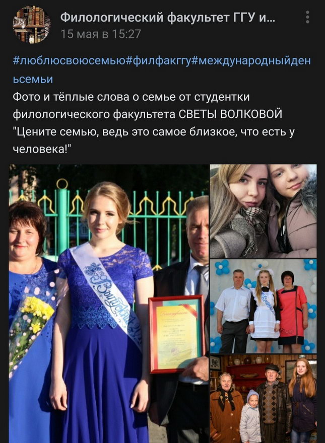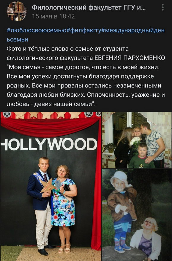 Интересным онлайн-мероприятием стал проект «Я люблю свою семью», посвящённый Международному дню семьи. Ребята делились семейными фотографиями и писали добрые слова в адрес своих близких: «У меня очень большая семья, с кем-то я более близка, с кем-то-менее. Но мне безумно нравится, что в любой ситуации я могу найти поддержку дома, меня никогда не оставят одну. Что бы ни случилось, я знаю: мои родные рядом» (Аня Шевченко); «Моя семья – самое дорогое, что есть в моей жизни. Все мои успехи достигнуты благодаря поддержке родных. Все мои провалы остались незамеченными благодаря любви близких» (Женя Пархоменко); «Моя семья – это пример для меня. Мы всегда друг за дружку» (Таня Пиминёнкова); «Величайшее в жизни счастье – это уверенность в том, что твоя семья тебя любит, любит за то, что мы такие, какие есть. Семья – это лучшее, что может быть в нашей жизни!» (Аня Самойленко). Этот проект, добрый, тёплый, трогательный, ещё раз позволил убедиться в том, что семья –  это маленький мир и при этом надежная крепость, что очень важно беречь своих близких, чаще благодарить их, им улыбаться им.