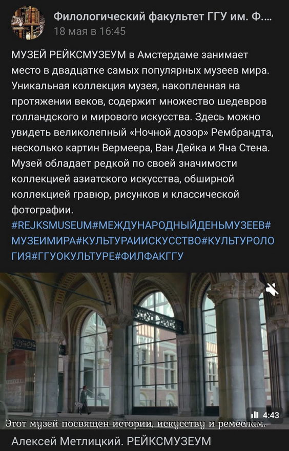 Ещё одним хорошим майским онлайн-мероприятием можно назвать культурно-просветительский проект «Культура и искусство глазами студентов» (кстати, он ещё продолжается). Мне всегда очень хотелось, чтобы людям был интересен мир культуры. Быть может, потому, что знания о культурном наследии разных народов помогают развиваться, становиться глубже, совершеннее, пожалуй, даже терпимее. Даже если вы скажете, что всё это не совсем оригинально или, быть может, не очень актуально, я позволю себе не согласиться, потому что творчество – это мир, который каждый раз открывается новыми гранями, дарит новые впечатления, раскрашивает жизнь новыми красками, потому что искусство – это некое таинство, которое невероятным образом сближает людей, живущих на разных континентах, разговаривающих на разных языках, исповедующих разные религии. Отмечу, что в этом проекте, кроме филологов, приняли участие студенты гр. АС-36 факультета физики и ИТ: они подготовили замечательные видеоролики, посвящённые знаменитым музеям мира.