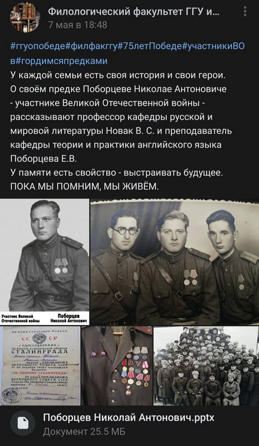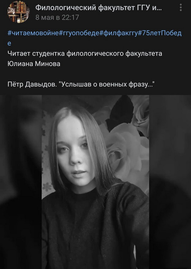 «По праву памяти…» Именно под таким девизом на филологическом факультете прошли онлайн-мероприятия, посвящённые 75-летию Победы в Великой Отечественной войне: студенты, преподаватели факультета читали стихотворения о событиях тех далёких времён (проект «Читаем о войне»), писали эссе о своих родственниках – участниках военных событий (проект «Мы памятаем нашых герояў»). Видеоматериалы, тексты, размещенные на страничке филологического факультета в социальной сети «ВКонтакте», вызвали большой интерес: к проекту присоединились и выпускники, и читатели странички.