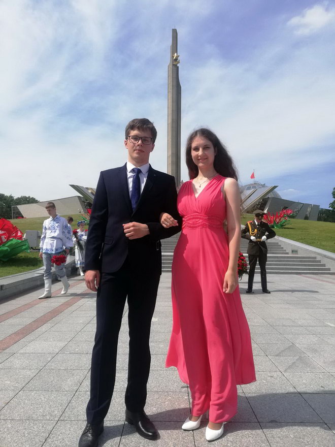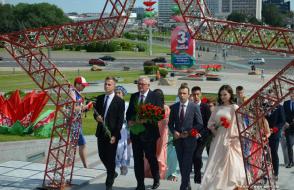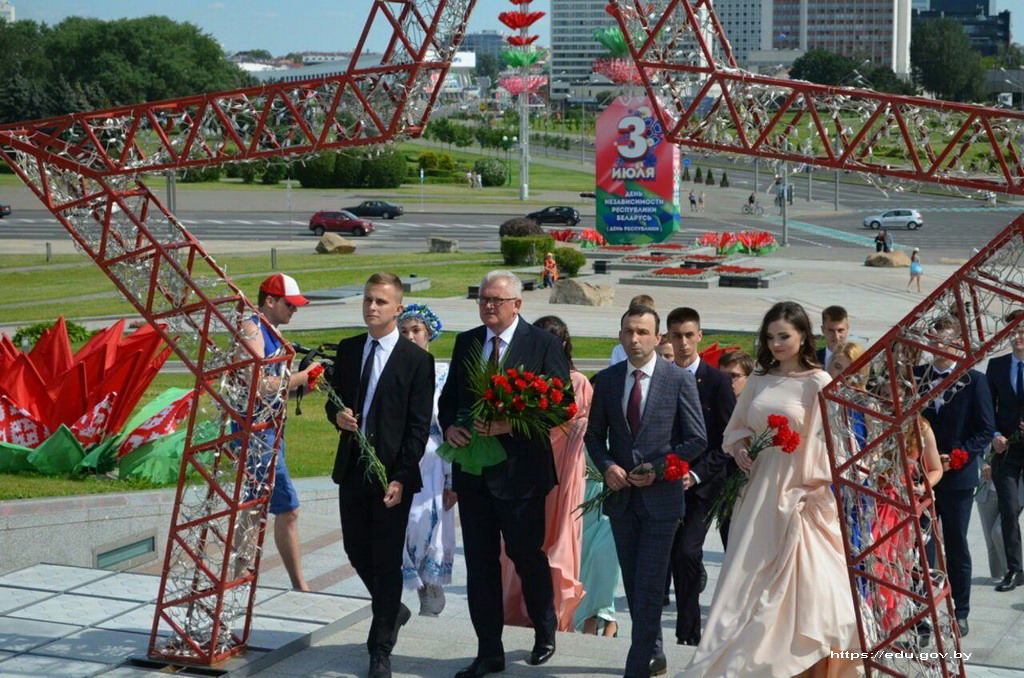 До начала основных празднований участники бала вместе с Министром образования Республики Беларусь Игорем Карпенко возложили цветы к стеле «Минск – город-герой».