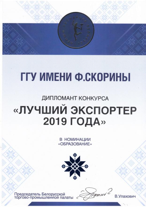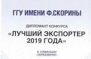 ГГУ отмечен в номинации «образование» по итогам республиканского конкурса «Лучший экспортер 2019 года». Конкурс традиционно проводился Белорусской торгово-промышленной палатой совместно с министерствами архитектуры и строительства, здравоохранения, иностранных дел, лесного хозяйства, промышленности, сельского хозяйства и продовольствия, транспорта и коммуникаций, экономики и рядом других государственных органов, организаций и бизнес-союзов по 22 номинациям.