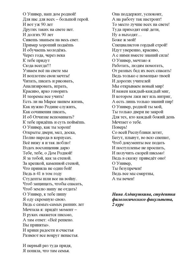 На суд требовательного жюри были представлены более 30 работ студентов, сотрудников и преподавателей. Авторами были предложены песенные, поэтические и прозаические произведения, в которых отражены все стороны жизни вуза на практически вековом пути становления.