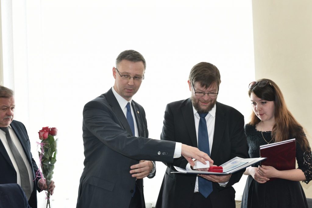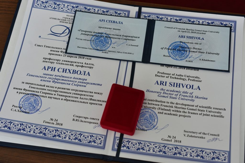 Звание «Почетного доктора ГГУ» присвоено профессору финского университета Аалто Ари Сихвола. Диплом и соответствующее удостоверение вручил ученому ректор ГГУ им. Ф. Скорины Сергей Хахомов на Совете университета.