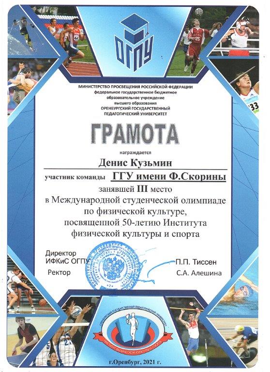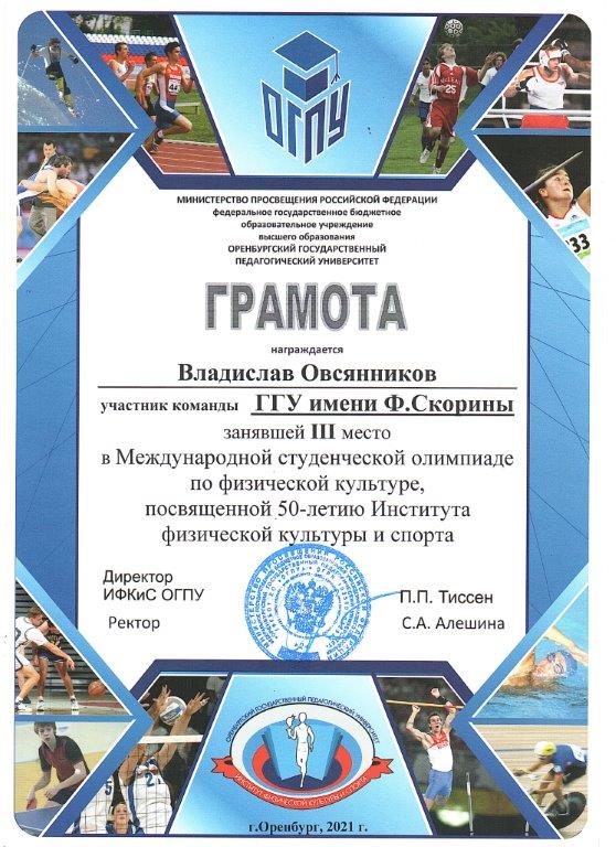 Команда студенческой научно-исследовательской лаборатории «Старт» (научный руководитель – Мельников С.В.) кафедры теории и методики физической культуры заняла 3 место в Международной студенческой олимпиаде по физической культуре, посвященной 50-летию Института физической культуры и спорта (Оренбургский государственный педагогический университет, Российская Федерация).
