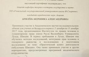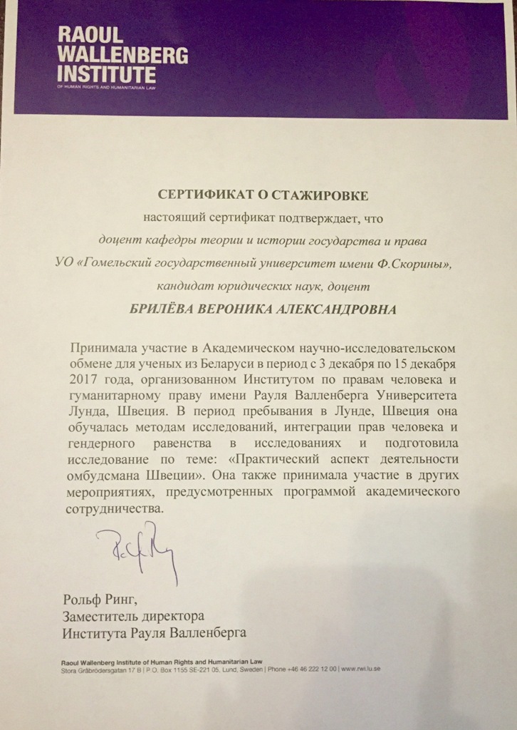 Доцент кафедры теории и истории государства и права Брилёва Вероника Александровна с 6-15.12.2017 проходила стажировку в Институте по правам человека и гуманитарному праву имени Рауля Валленберга (г. Лунд, Швеция), где обучалась методам исследований, интеграции прав человека и гендерного равенства в исследованиях и подготовила исследование по теме: «Практический аспект деятельности омбудсмана Швеции».