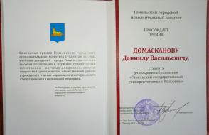 Семь лучших студентов высших учебных заведений города Гомеля удостоены премий Гомельского городского исполнительного комитета. Среди них и студент факультета физики и информационных технологий нашего университета Даниил Домасканов.