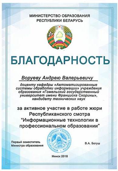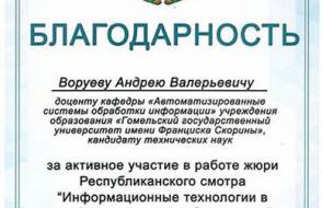 С 24 по 26 апреля на базе Могилёвского государственного Ордена Трудового Красного Знамени профессионального агролесотехнического колледжа имени К. П. Орловского проходил заключительный этап IV республиканского смотра «Информационные технологии в профессиональном образовании», где в работе жюри принял участие доцент кафедры АСОИ факультета физики и информационных технологий ГГУ Воруев Андрей Валерьевич.